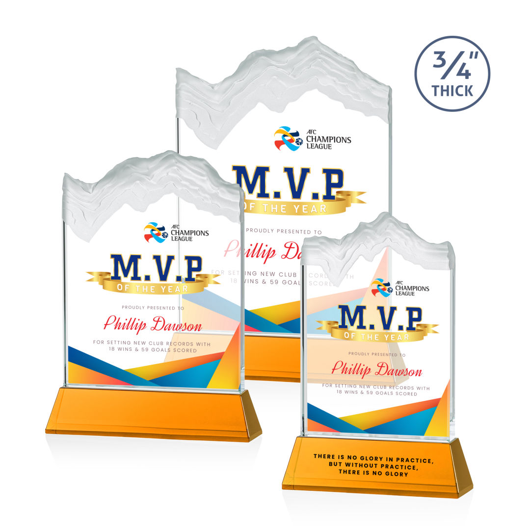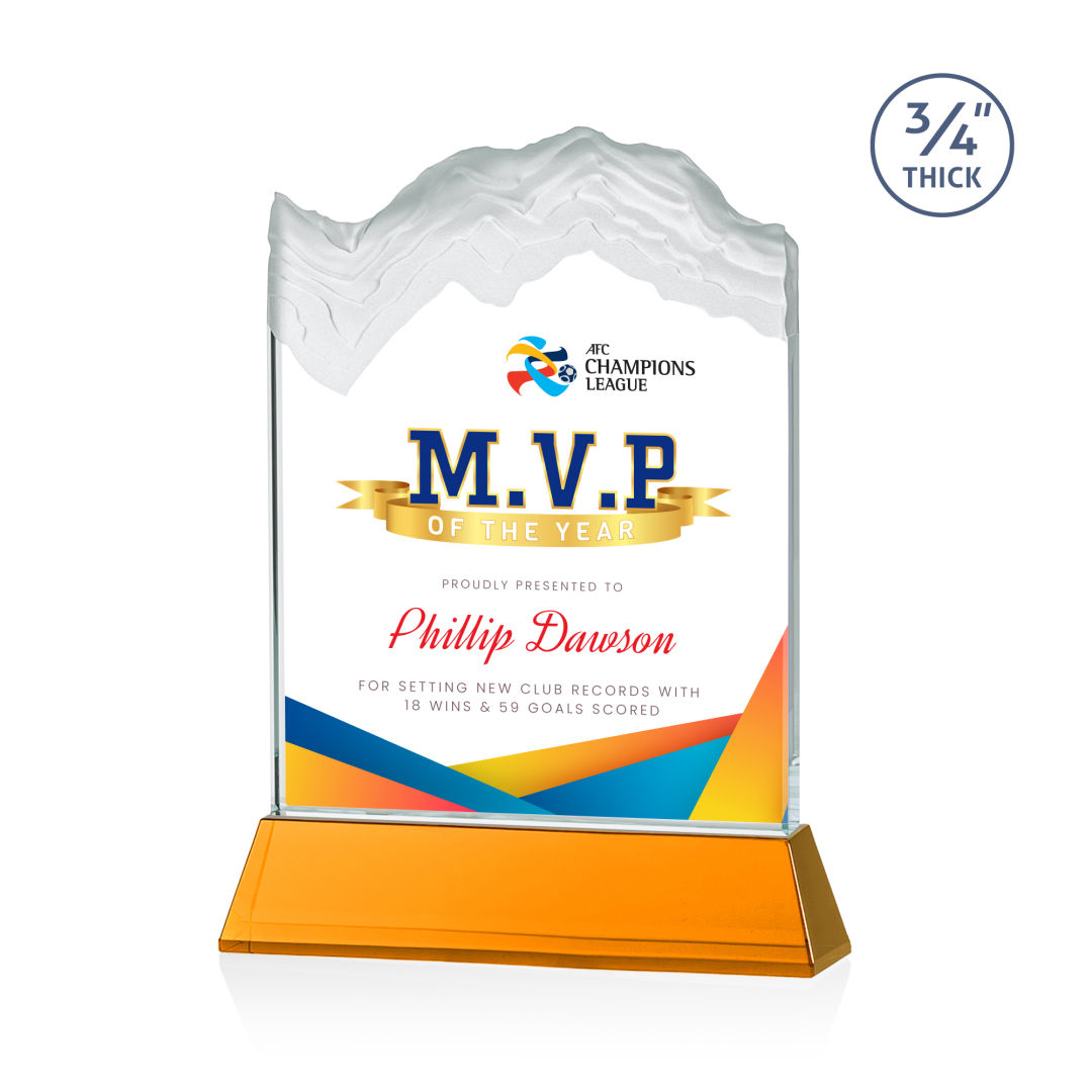 The stunning Kilimanjaro VividPrint™ award features deep carved and frosted peaks in 3/4″ thick Starfire Crystal. Mounted on the tall tapered Optical Crystal Newhaven Base. A perfect award for a momentous achievement. Let your message POP! with full color VividPrint™! 2nd position optional. 5.0″ W x 7.5″ H x 2.0″ D