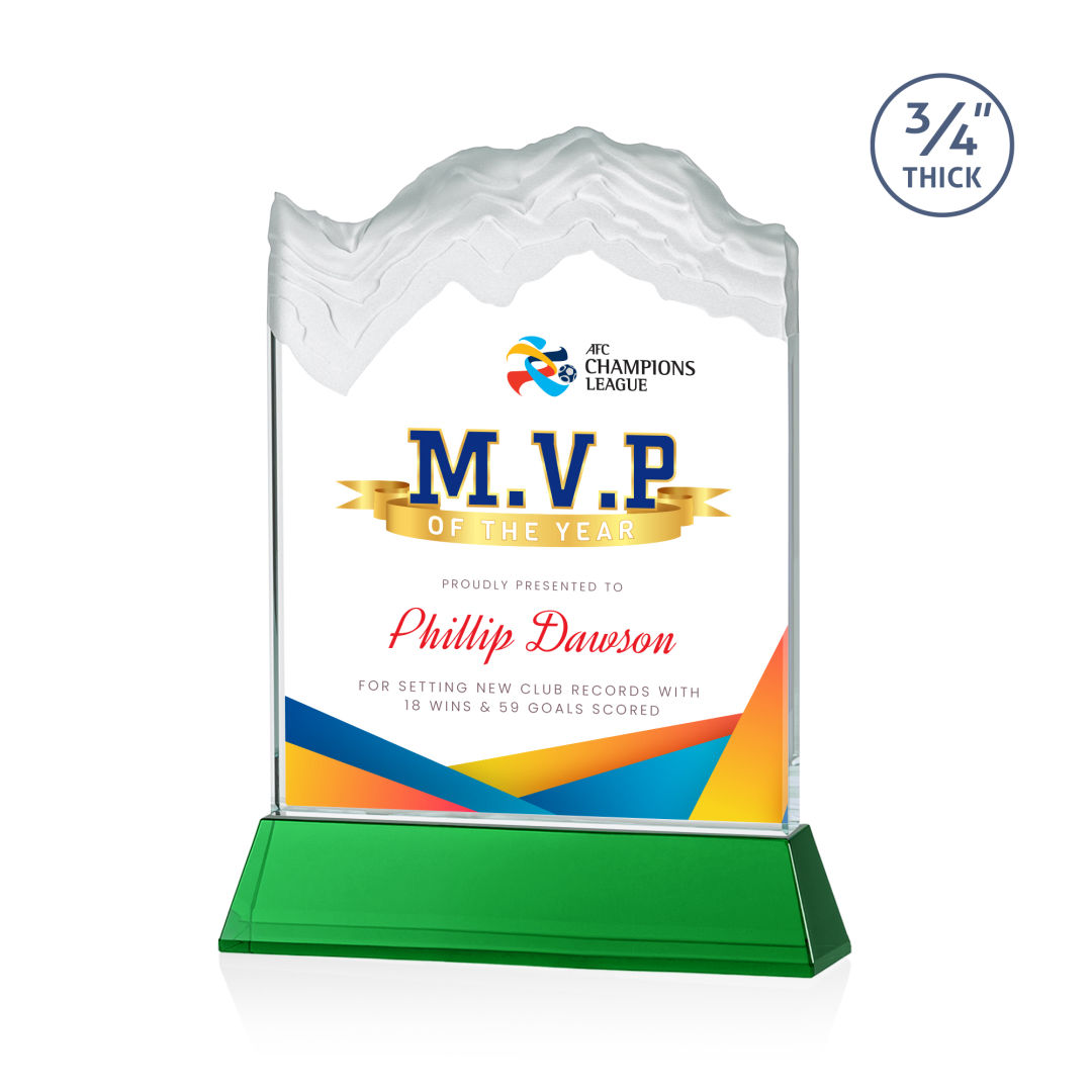 The stunning Kilimanjaro VividPrint™ award features deep carved and frosted peaks in 3/4″ thick Starfire Crystal. Mounted on the tall tapered Optical Crystal Newhaven Base. A perfect award for a momentous achievement. Let your message POP! with full color VividPrint™! 2nd position optional. 5.0″ W x 7.5″ H x 2.0″ D