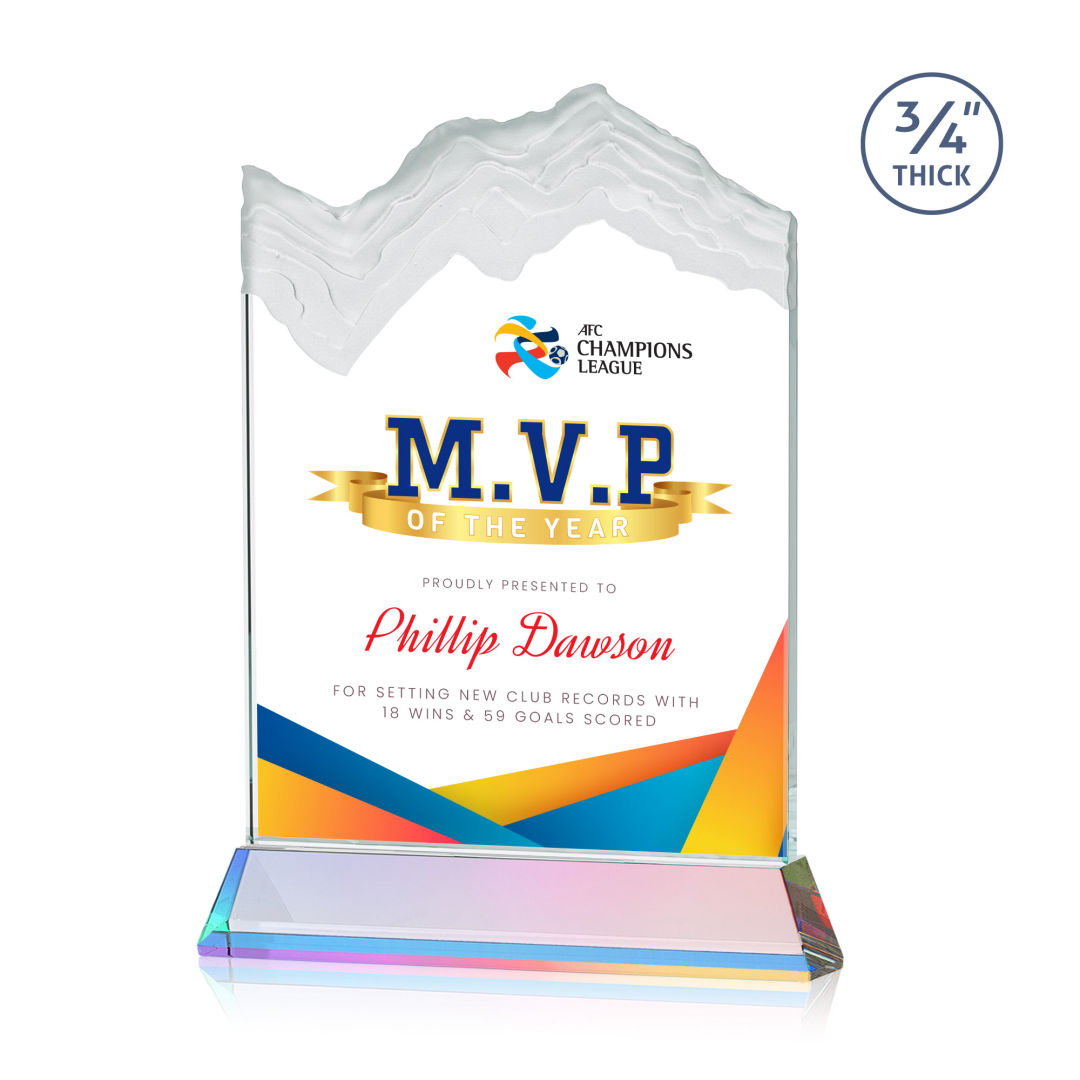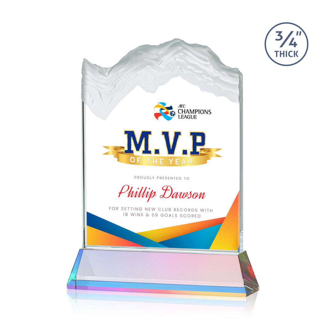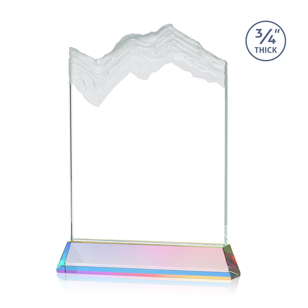 The stunning Kilimanjaro VividPrint™ award features deep carved and frosted peaks in 3/4″ thick Starfire Crystal. Mounted on the tall tapered Optical Crystal Newhaven Base. A perfect award for a momentous achievement. Let your message POP! with full color VividPrint™! 2nd position optional. 5.0″ W x 7.5″ H x 2.0″ D