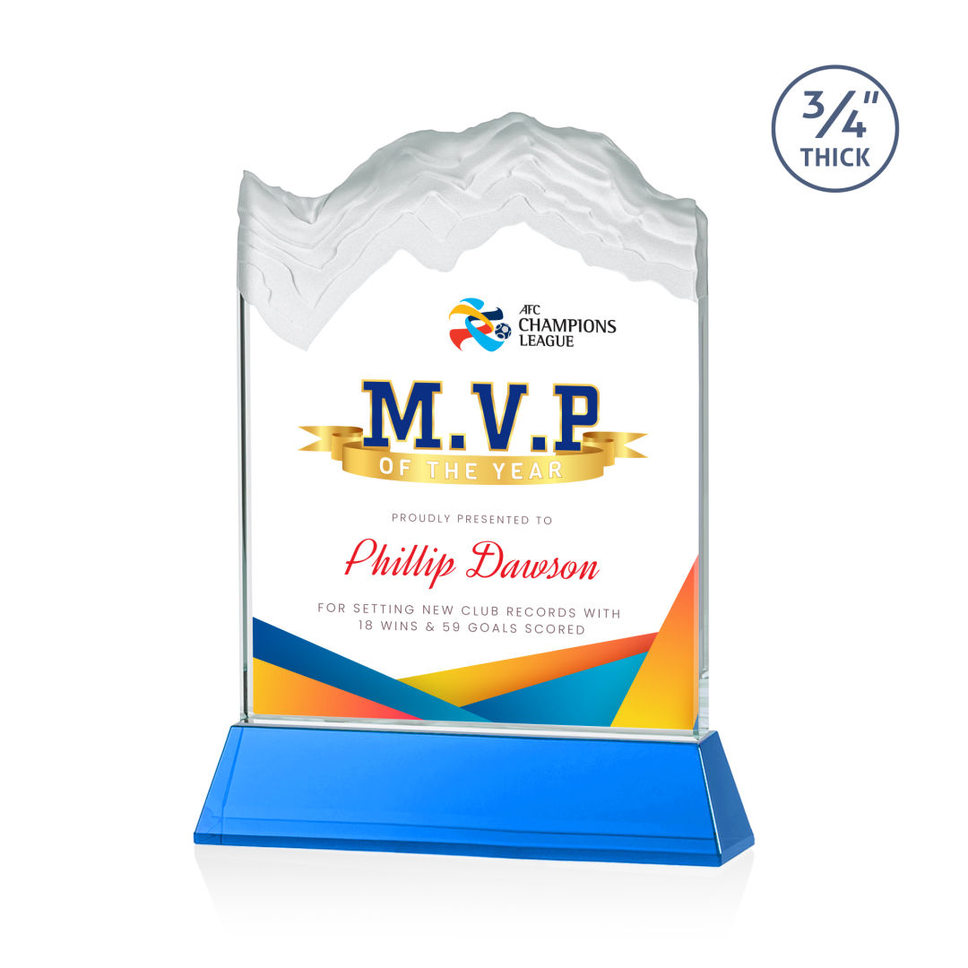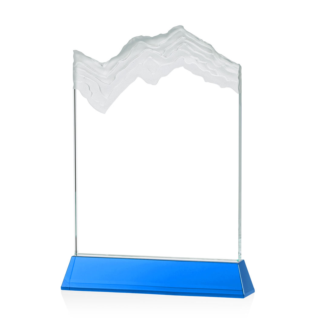 The stunning Kilimanjaro VividPrint™ award features deep carved and frosted peaks in 3/4″ thick Starfire Crystal. Mounted on the tall tapered Optical Crystal Newhaven Base. A perfect award for a momentous achievement. Let your message POP! with full color VividPrint™! 2nd position optional. 5.0″ W x 7.5″ H x 2.0″ D