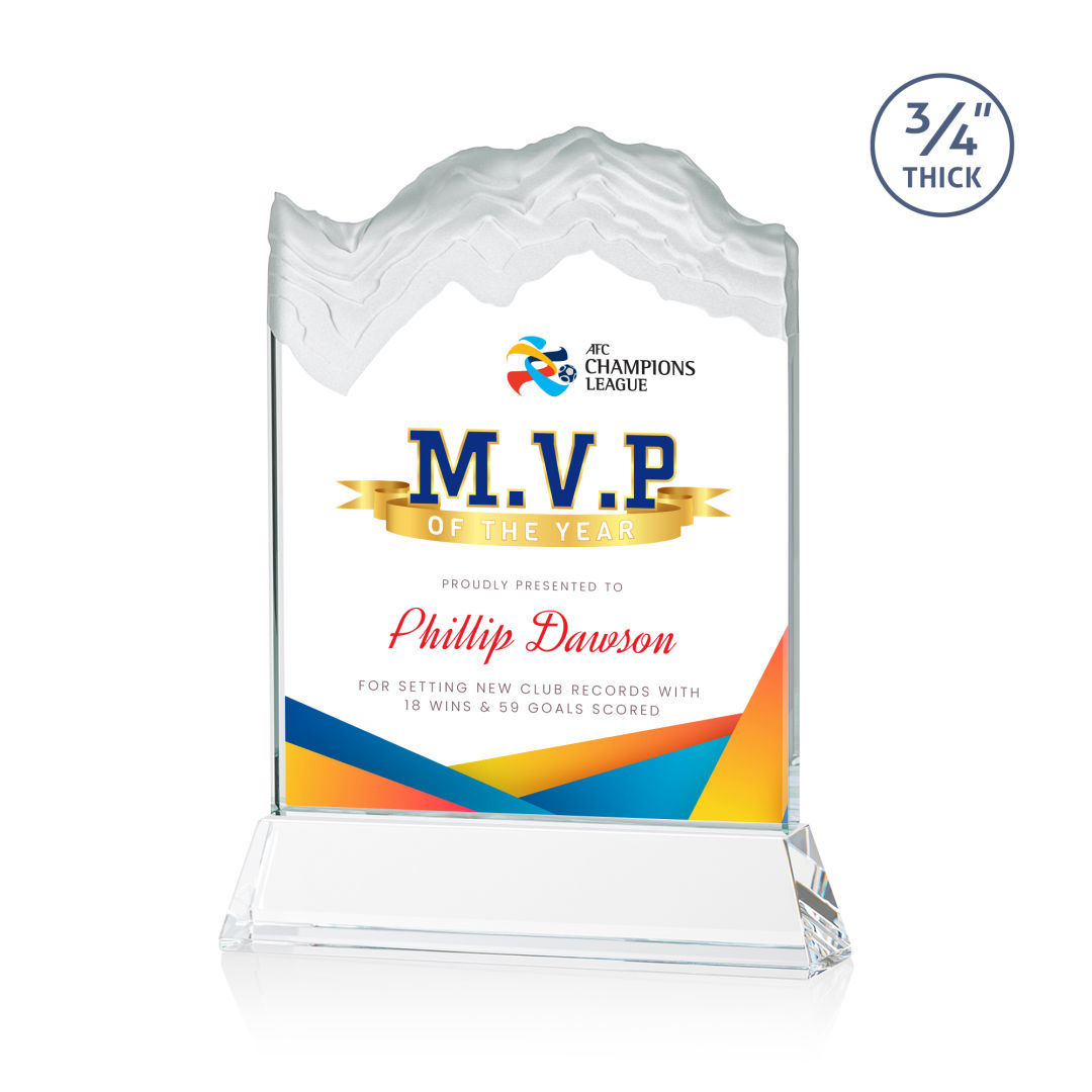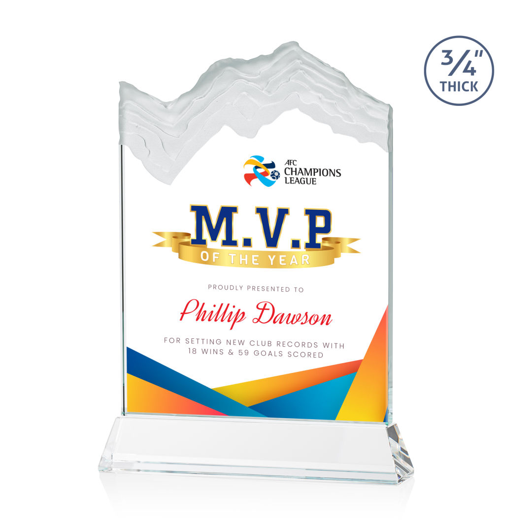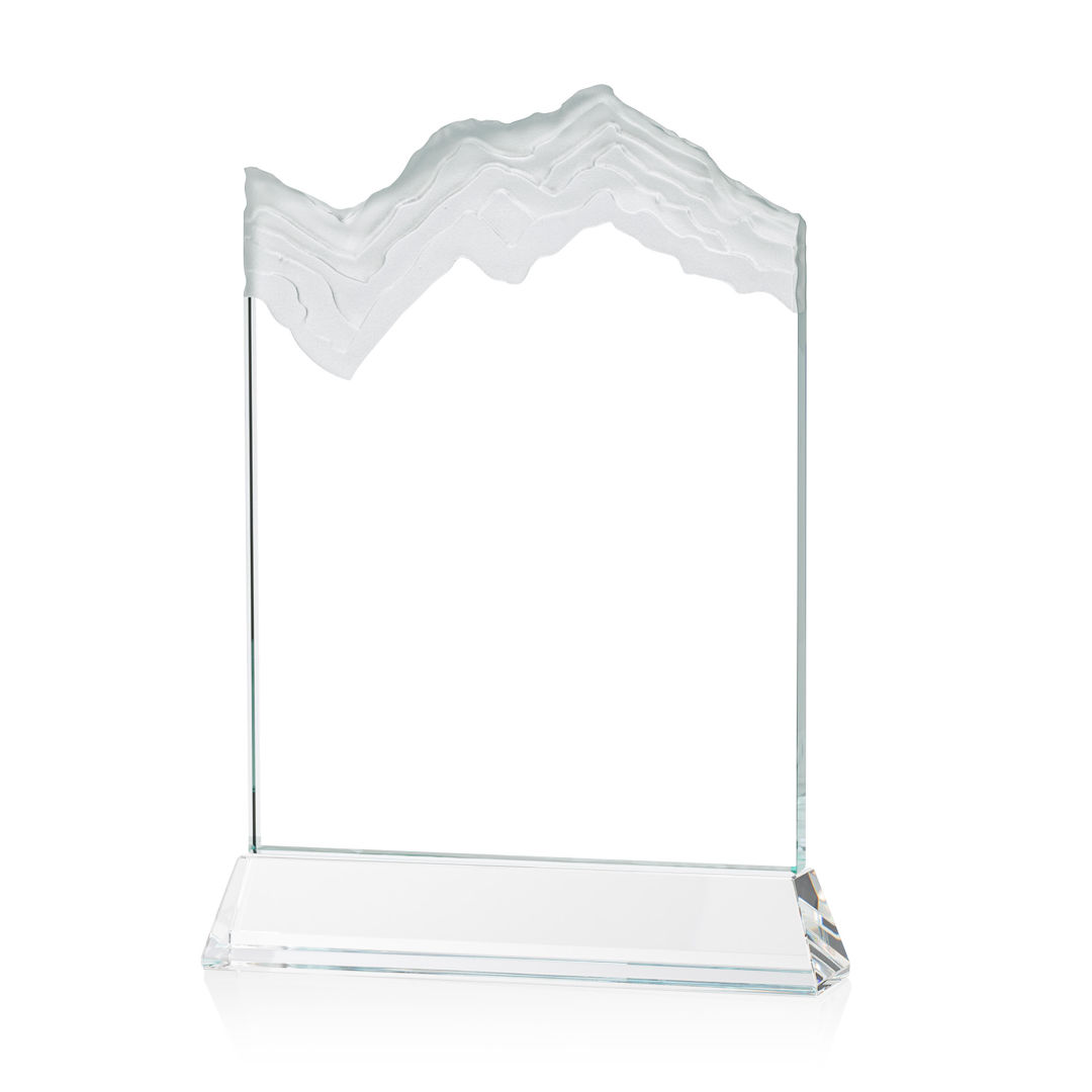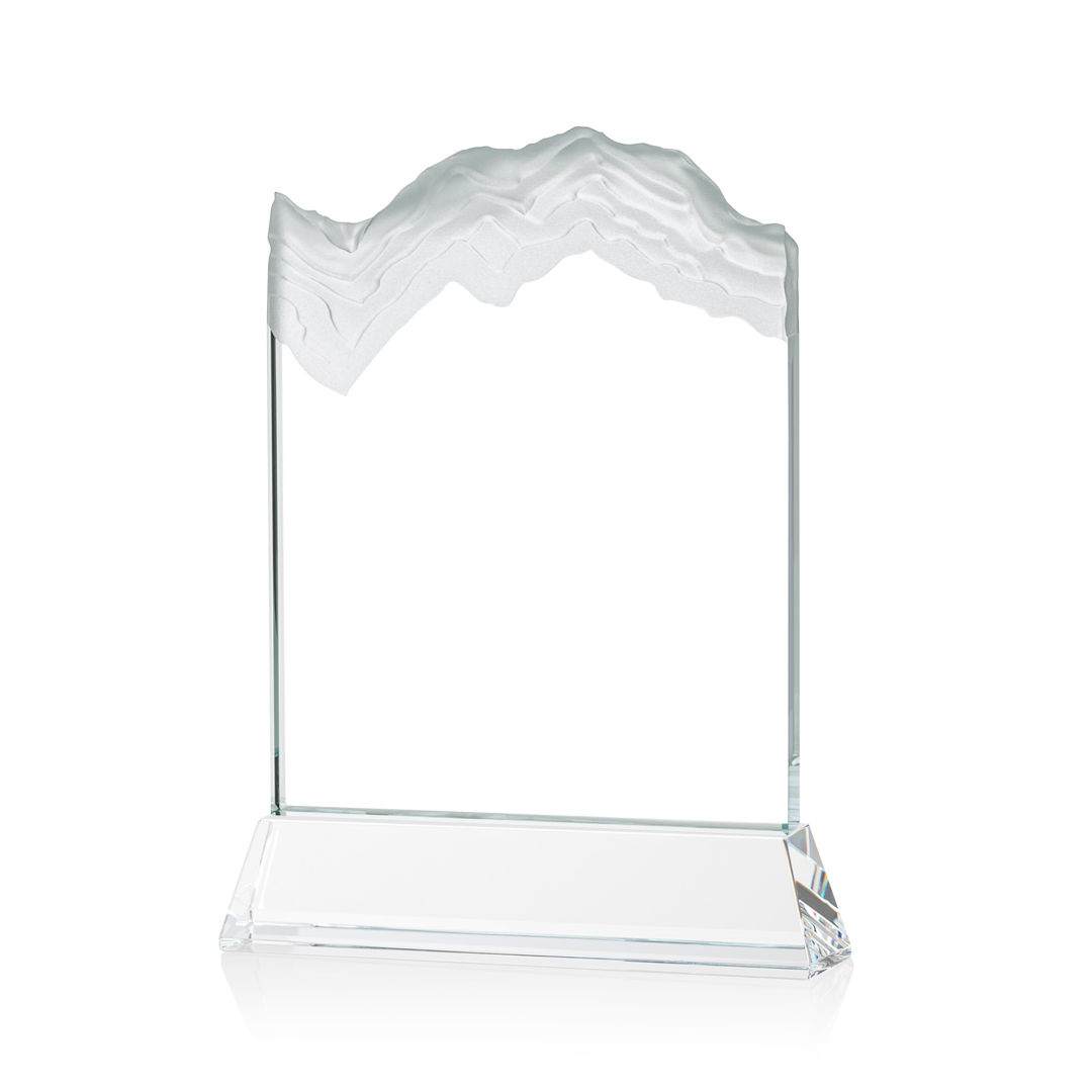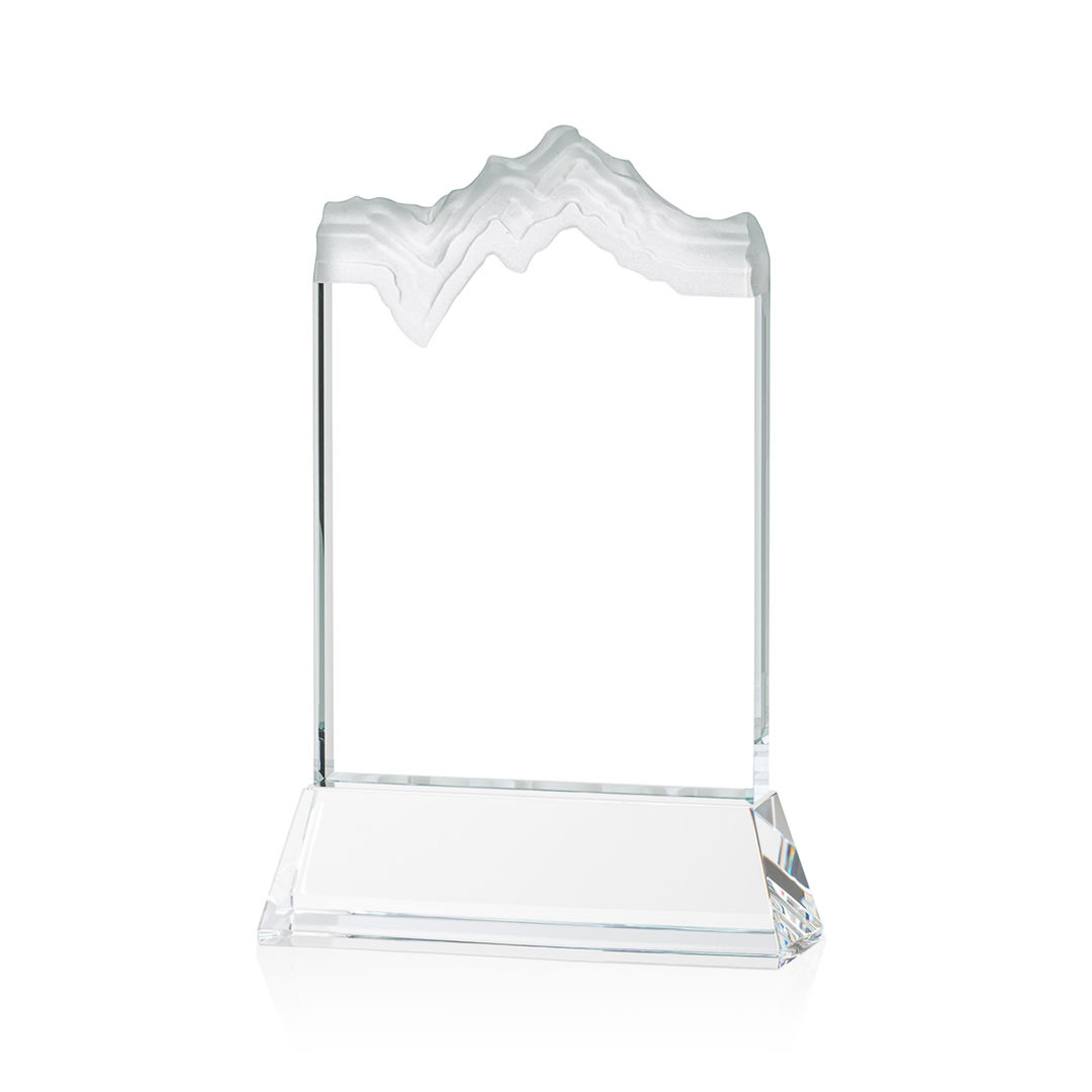 The stunning Kilimanjaro VividPrint™ award features deep carved and frosted peaks in 3/4″ thick Starfire Crystal. Mounted on the tall tapered Optical Crystal Newhaven Base. A perfect award for a momentous achievement. Let your message POP! with full color VividPrint™! 2nd position optional. 5.0″ W x 7.5″ H x 2.0″ D