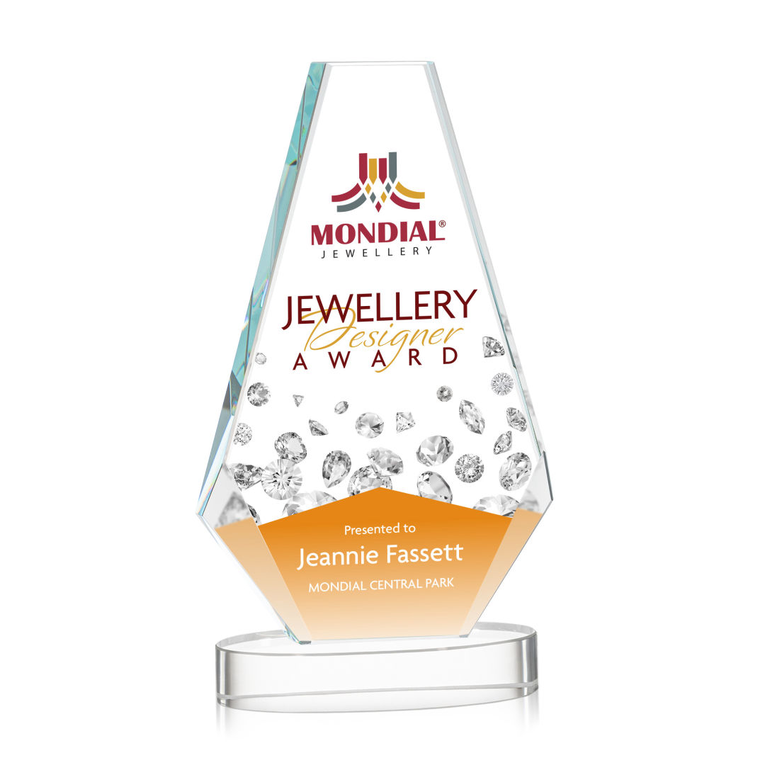 The Optical Crystal Kingsley VividPrint™ Award is flawless in its symmetrical design, with its squared top that slants down toward the base which features beautifully beveled edges. Mounted on an oval Alberton optical base in your choice of 8 distinct colors. The Kingsley is the perfect award fit for recognizing a spectacular achievement! Bring your artwork to life with full-color VividPrint™! 4.25″ W x 7.0″ H x 2.5″ D