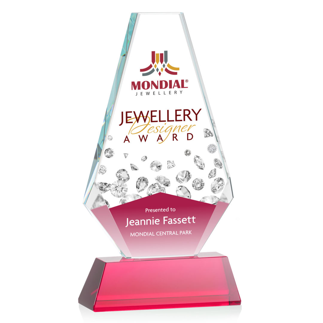 The Optical Crystal Kingsley VividPrint™ Award is flawless in its symmetrical design, with its squared top that slants down toward the base which features beautifully beveled edges. Mounted on a tall tapered optical base in your choice of 8 distinct colors. The Kingsley is the perfect award fit for recognizing a spectacular achievement! Second position imprint optional. 4.25″ W x 7.5″ H x 2.0″ D