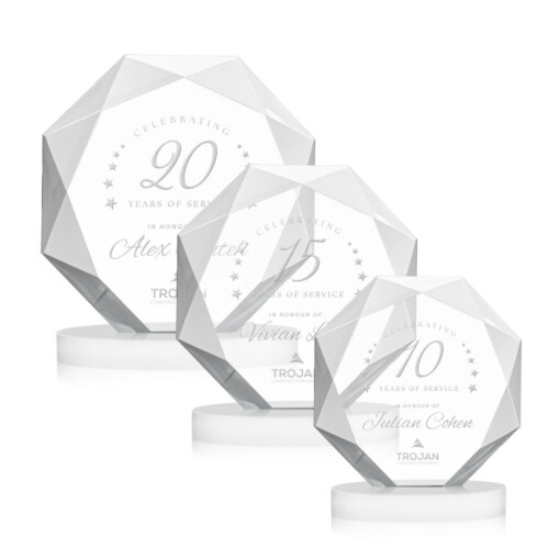 Striking Starfire Octagon award refracts light through all of its facets creating a brilliant display for achievement recognition. Available in 3 sizes and 9 different colored Alberton bases. 6.0″ W x 7.0″ H x 2.75″ D