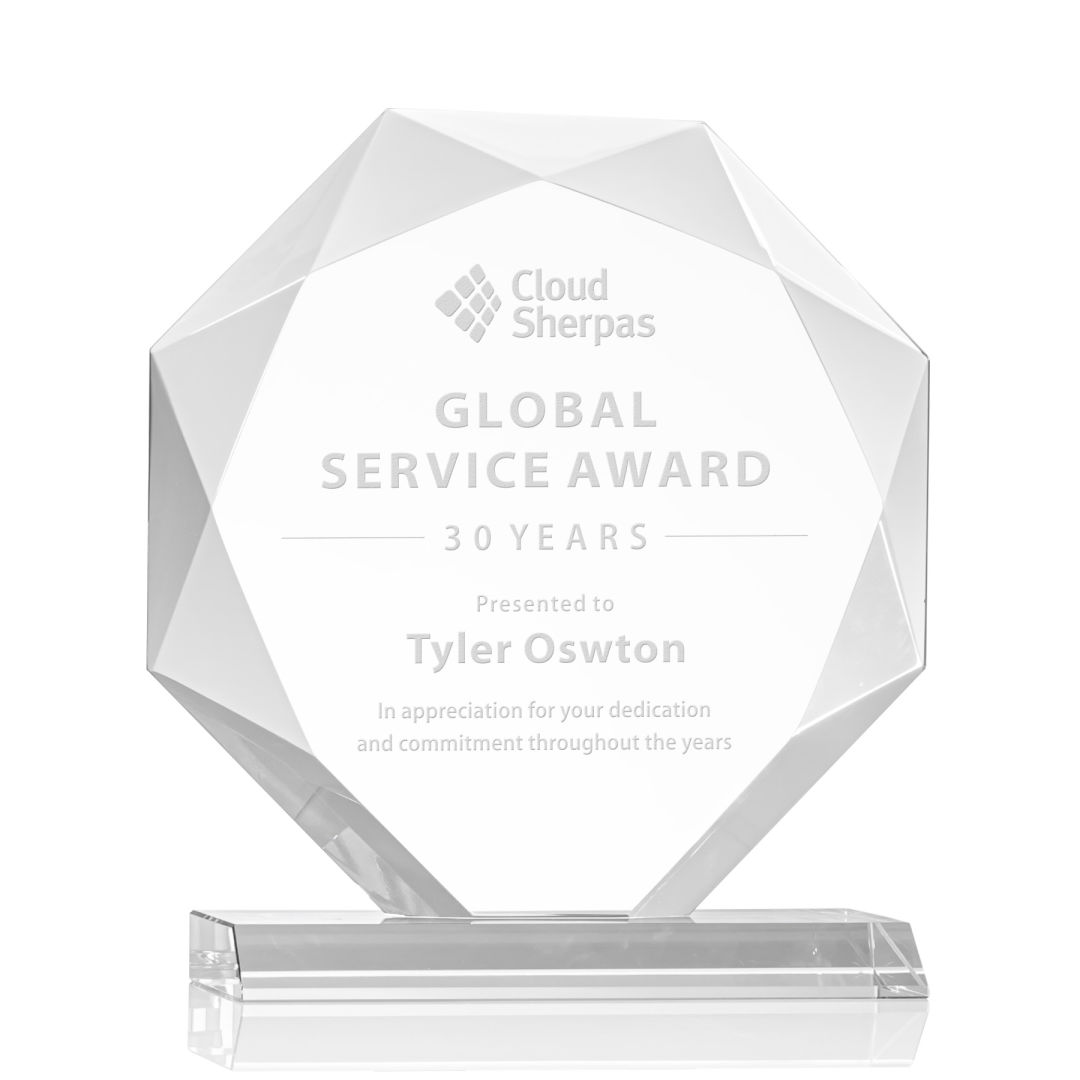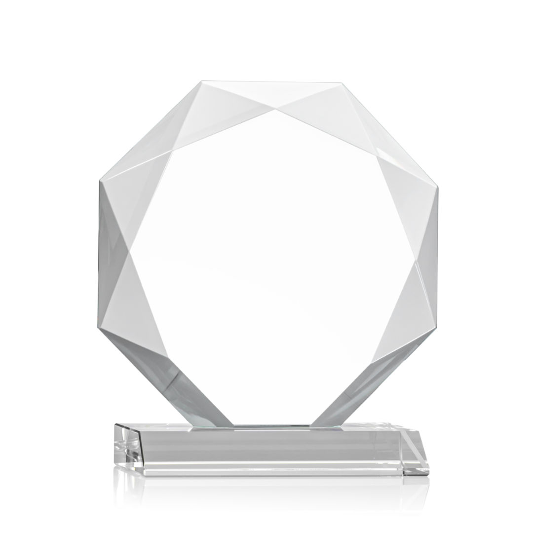 Striking Starfire Octagon award refracts light through all of its facets creating a brilliant display for achievement recognition. Available in 3 sizes and 10 different colored bases.Second Position Etch & Colorfill Optional. 6.0″ W x 6.75″ H x 3.0″ D