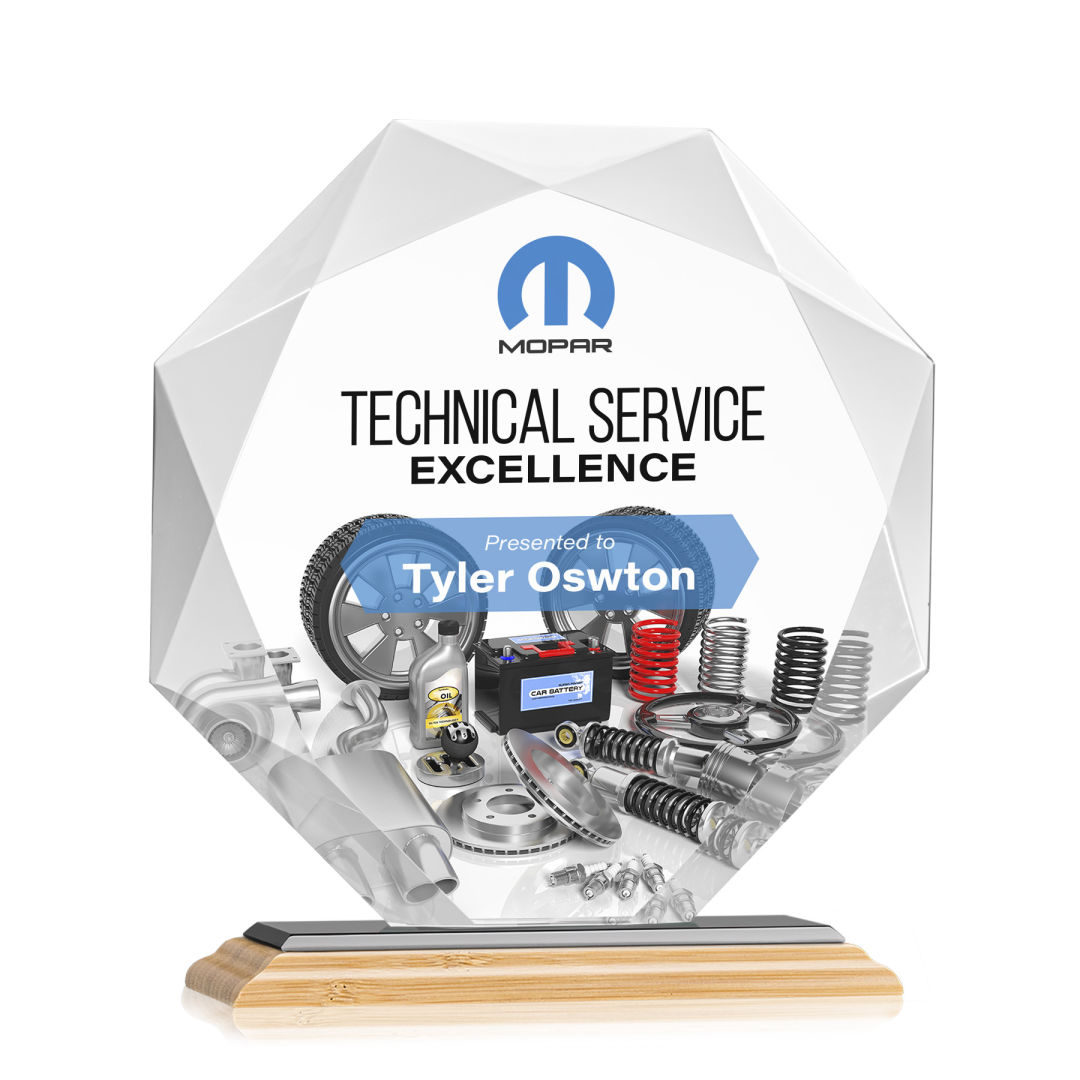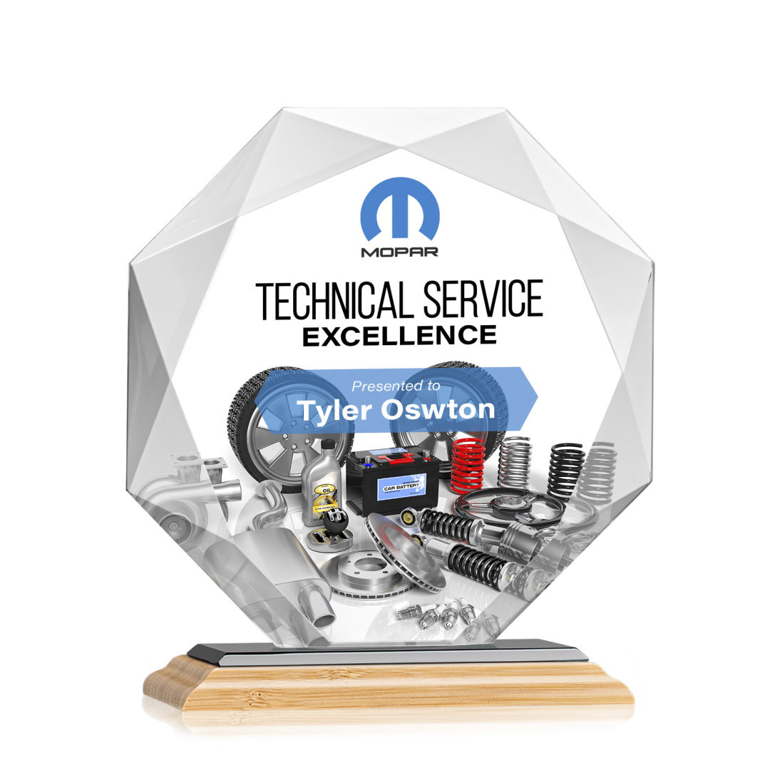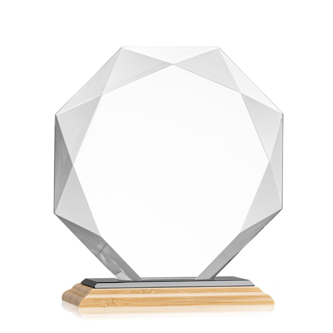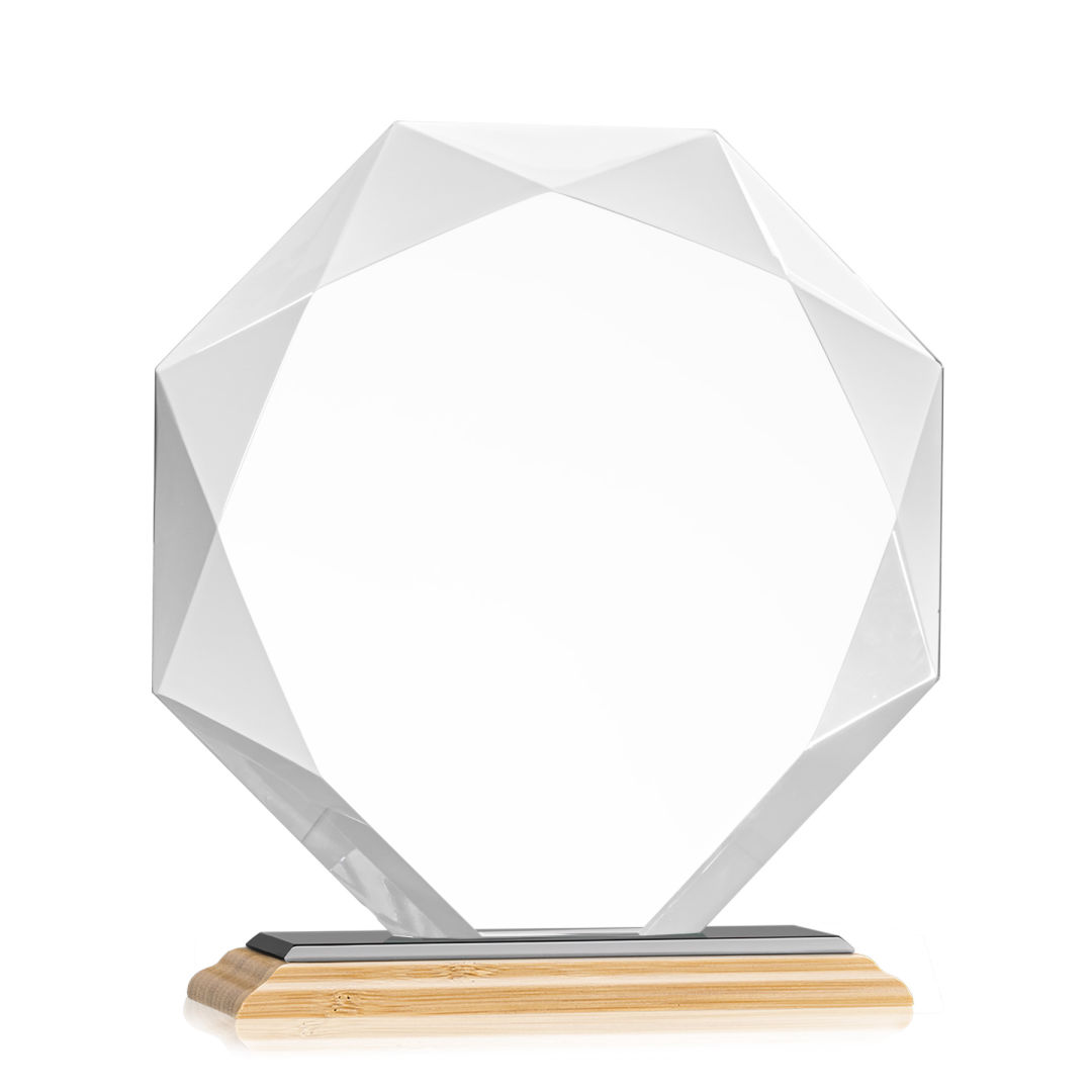 Striking Starfire Octagon award refracts light through all of its facets creating a brilliant display for achievement recognition. Available in 3 sizes and 12 different colored bases. Let your message POP with full color VividPrint! 6.0″ W x 6.75″ H x 3.0″ D