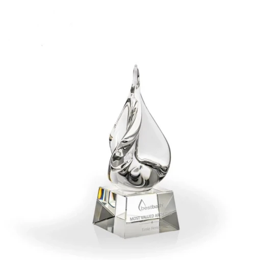 Classic, beautiful art glass, the La Garde Clear Art Glass Award is versatile as a recognition gift and makes a stunning statement. Handblown clear glass twists slightly upward, creating a stylized teardrop formation. The La Garde Clear Art Glass Award sits atop a stunning clear base, that features plenty of room for adding logos and award information. This award stands at 8.5″ tall and 3.25″ wide. Bubbles and swirls are a part of the process and are considered normal and acceptable. 8 1/2″ H x 3 1/4″ W x 3 1/4″ D