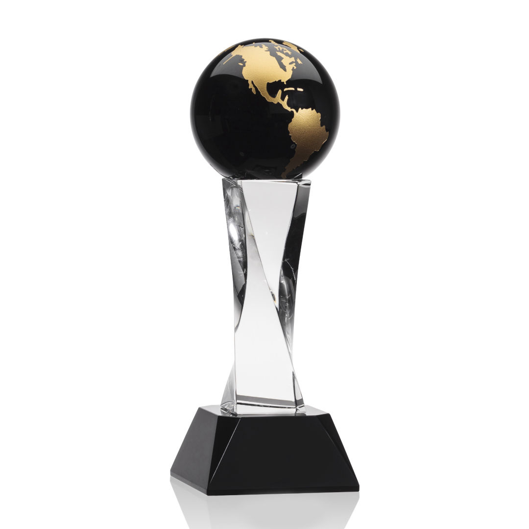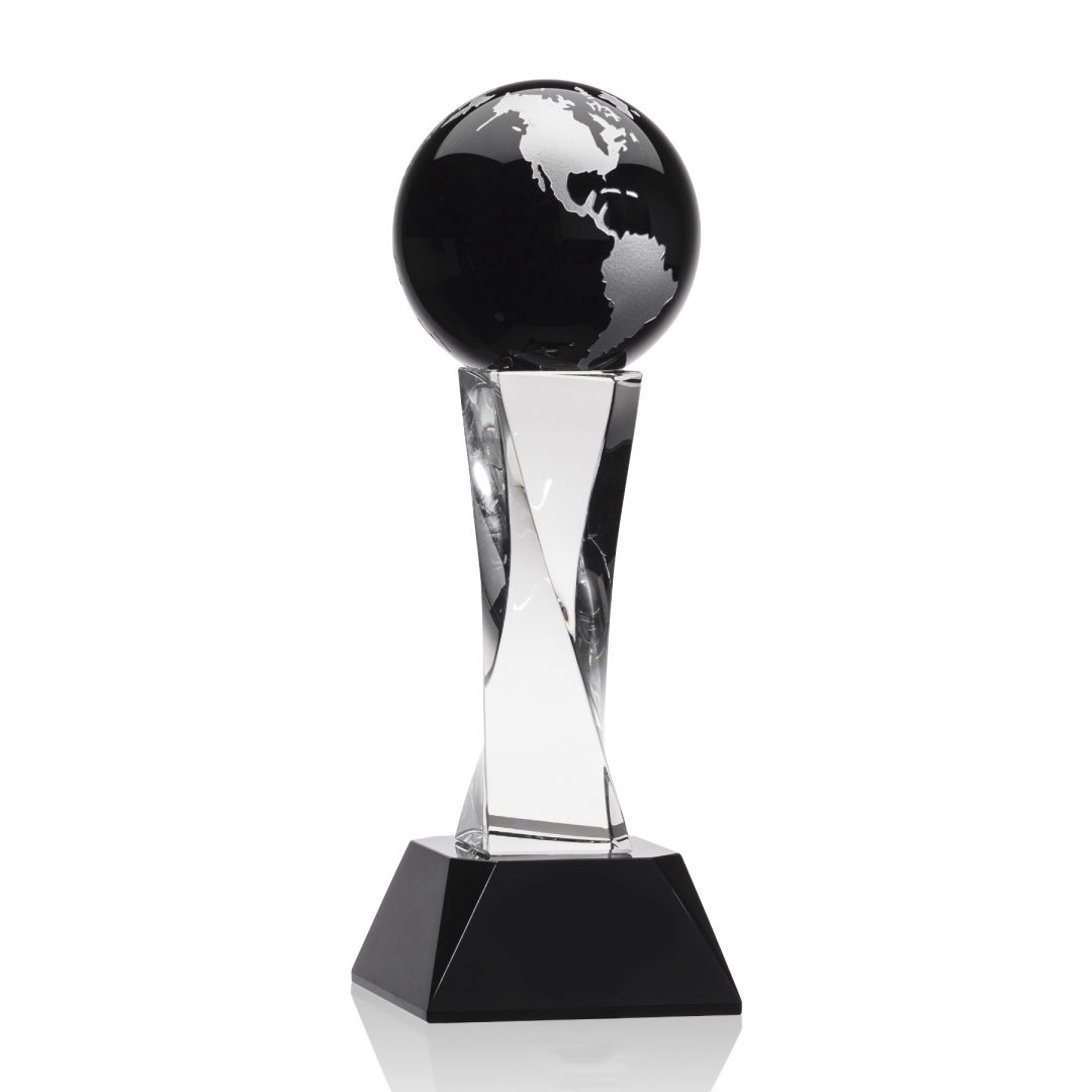 The Langford Globe Award features an elegant 4″ Black Optical Crystal globe with the continents deep etched with gold or silver colorfill. The globes are perched on top of a uniquely twisted stand, which is resting on a Black Optical Base that carries your words of achievement with deep etch and 1 colorfill included. 11.5″ H