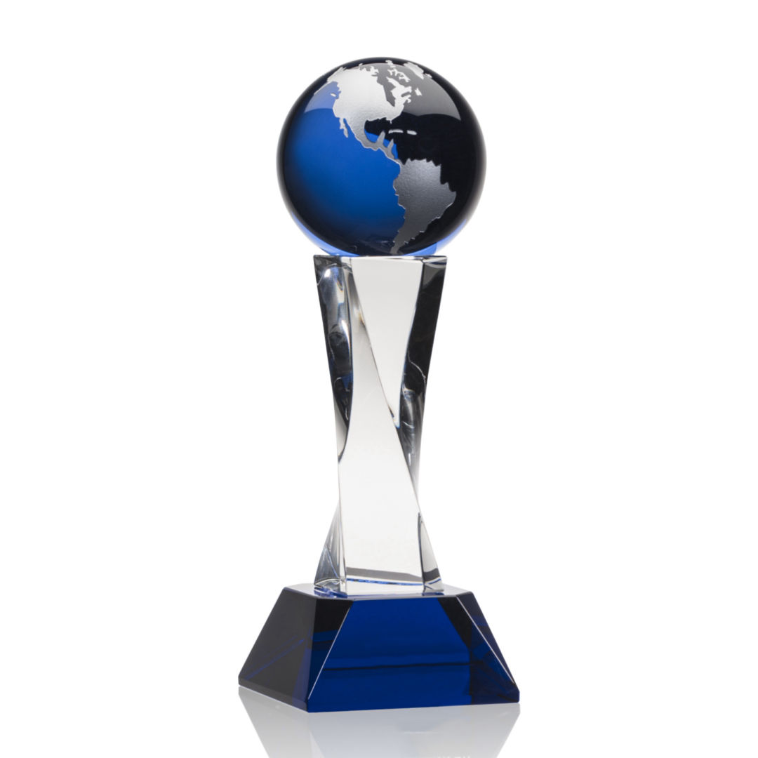 The Langford Globe Award features an elegant 4″ Blue Optical Crystal globe with the continents deep etched with gold or silver colorfill. The globes are perched on top of a uniquely twisted stand, which is resting on a Blue Optical Base that carries your words of achievement with deep etch and 1 colorfill included. 11.5″ H
