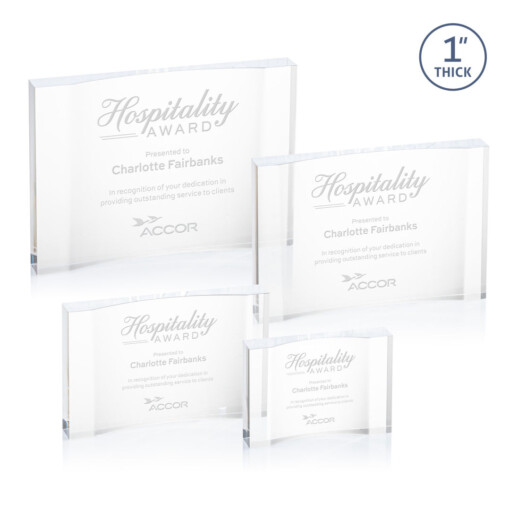 The freestanding acrylic Langworth Award is a stunning, thick accolade that radiates brilliance. Its unique inward curve provides a sophisticated space for your personalized words of recognition. This award is the perfect way to honor exceptional achievements in any industry with elegance and distinction. 5.0″ W x 3.5″ H x 0.875″ D