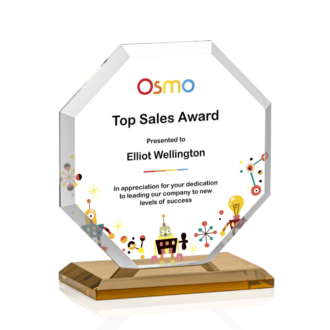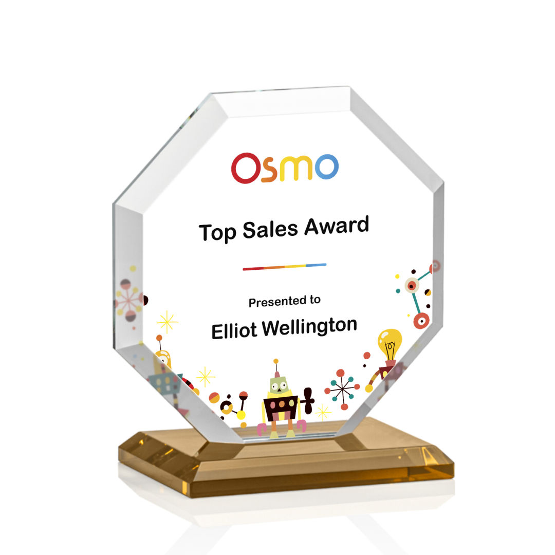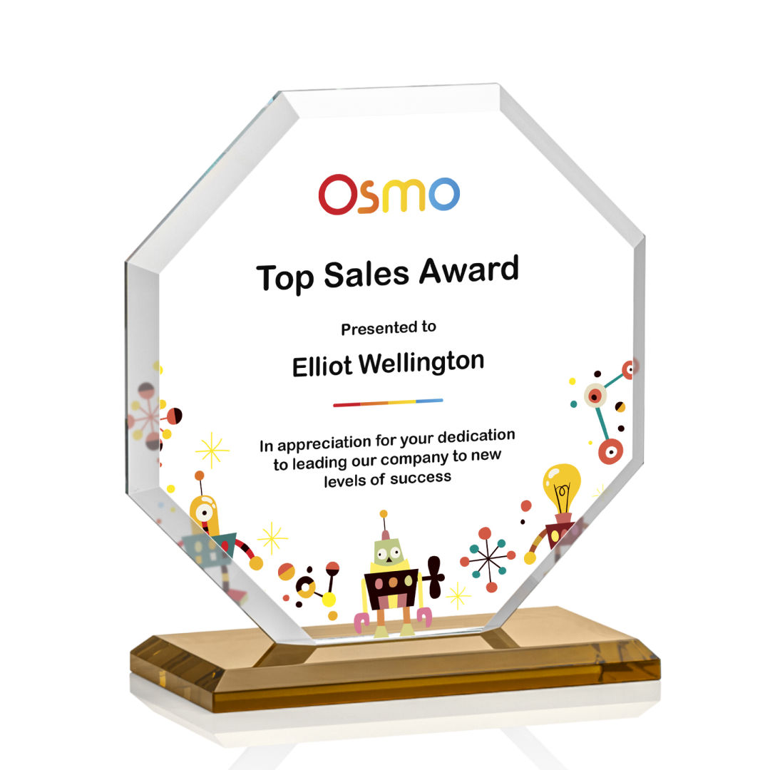 The Layland VividPrint™ Award features a beautifully beveled Starfire Crystal Octagon mounted on your choice of 9 distinct bases. The large decorating area is highlighted by the deep mitered edges that frame your outstanding achievement with refracted light. 4.0″ W x 4.5″ H