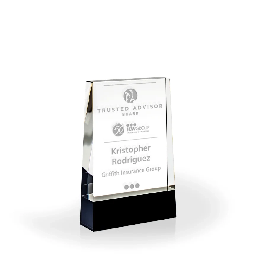 The Liam Fused Black and Clear Crystal Award is an excellent choice for those seeking elegance without breaking the bank. This award boasts ample space for engraving a logo and text, making it an ideal option for those on a tighter budget. 8.5″ H x 5.5″ W x 1.5″ D