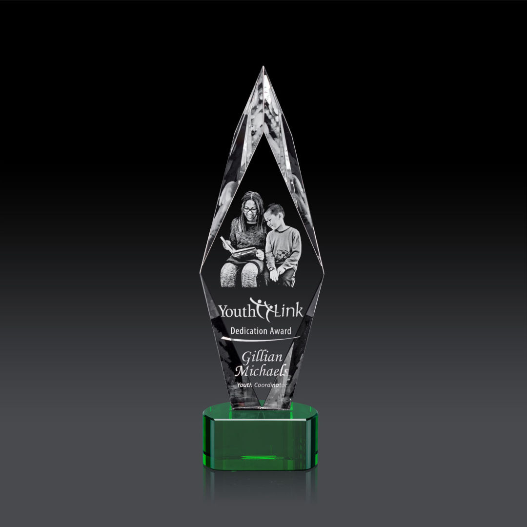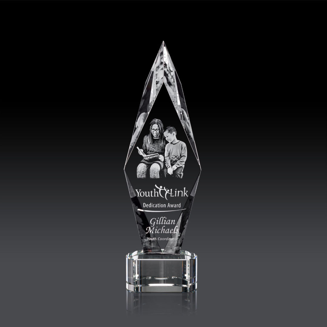 The Libra is a beautiful tapered block of pure optical crystal with a stylized, angled optical star fused to the top. A distinctive and attractive configuration for the star theme, ideal for top performers and stars of the organization. Second position etch optional. 6.5″ W x 8.0″ H x 2.5″ D