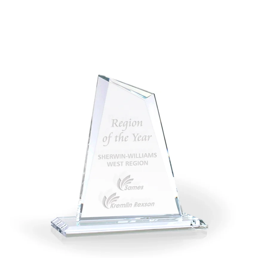 The Lindsay Achievement Award is a 1/2″ thick, highly polished glass award with bevelled edges. It is a fabulous option when you want to recognize outstanding performance, contributions, or commemorate a special event or occasion. It is available in 4 sizes: 6″ tall, 7″ tall, 8″ tall, and 9″ tall. 8″ H x 6 1/2″ W x 2 1/2″ D