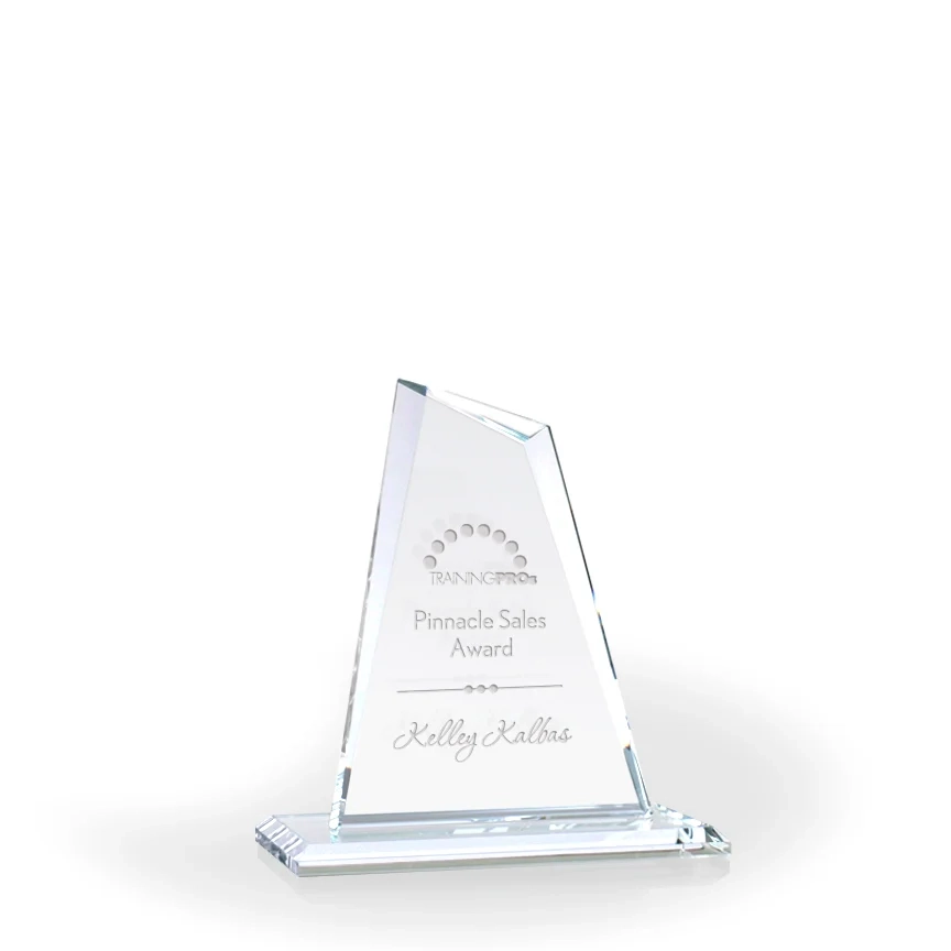 The Lindsay Achievement Award is a 1/2″ thick, highly polished glass award with bevelled edges. It is a fabulous option when you want to recognize outstanding performance, contributions, or commemorate a special event or occasion. It is available in 4 sizes: 6″ tall, 7″ tall, 8″ tall, and 9″ tall. 6″ H x 4 1/2″ W x 2″ D