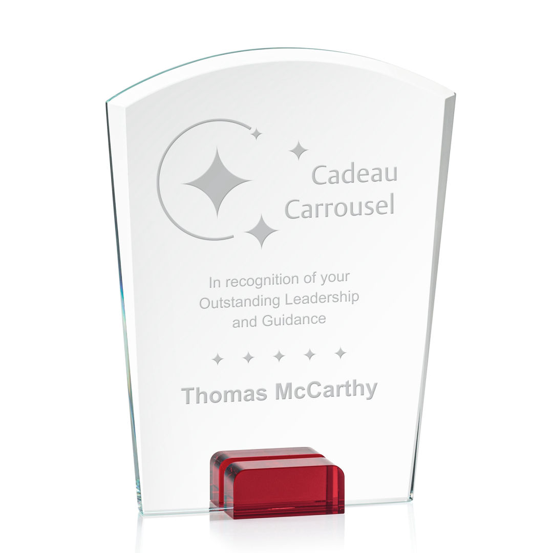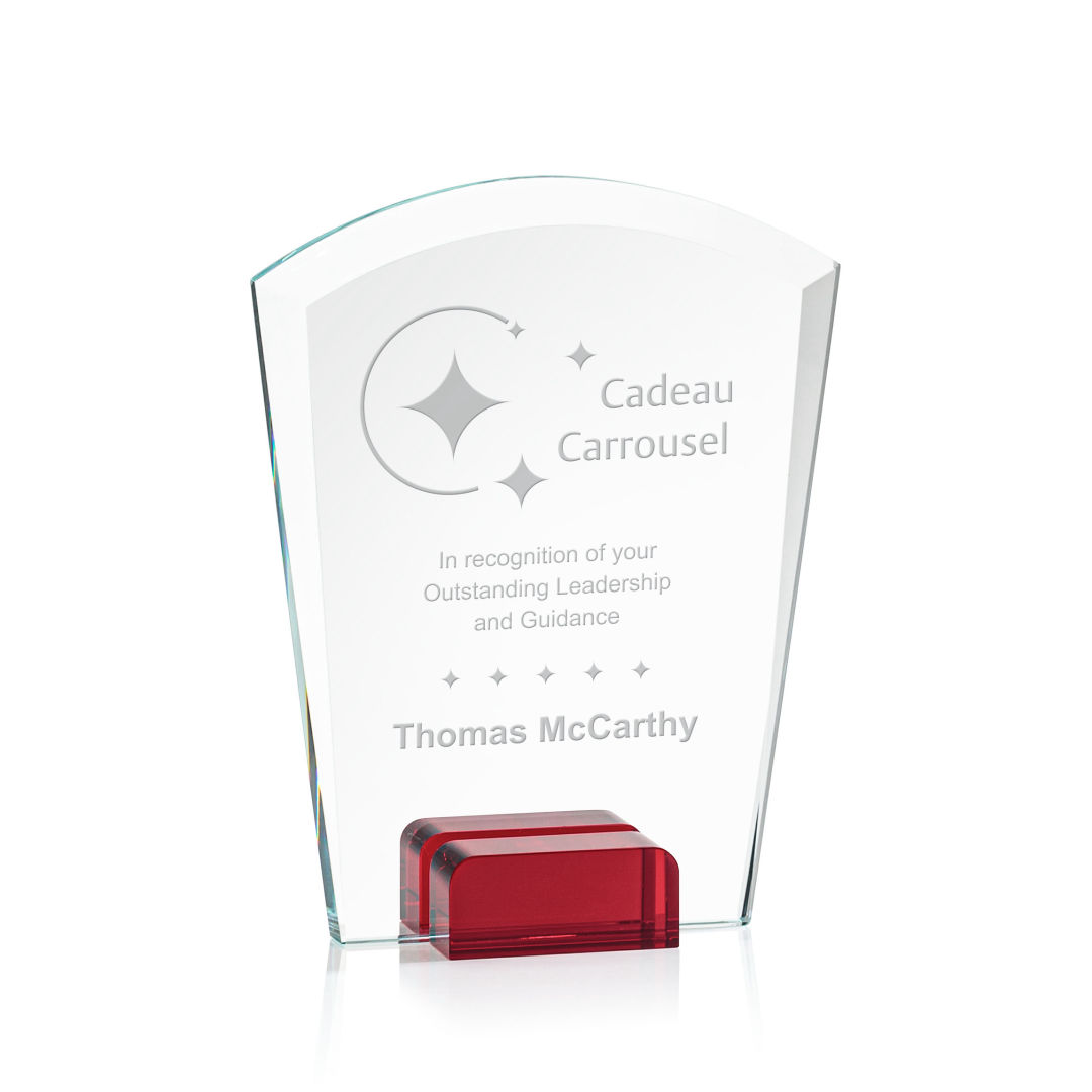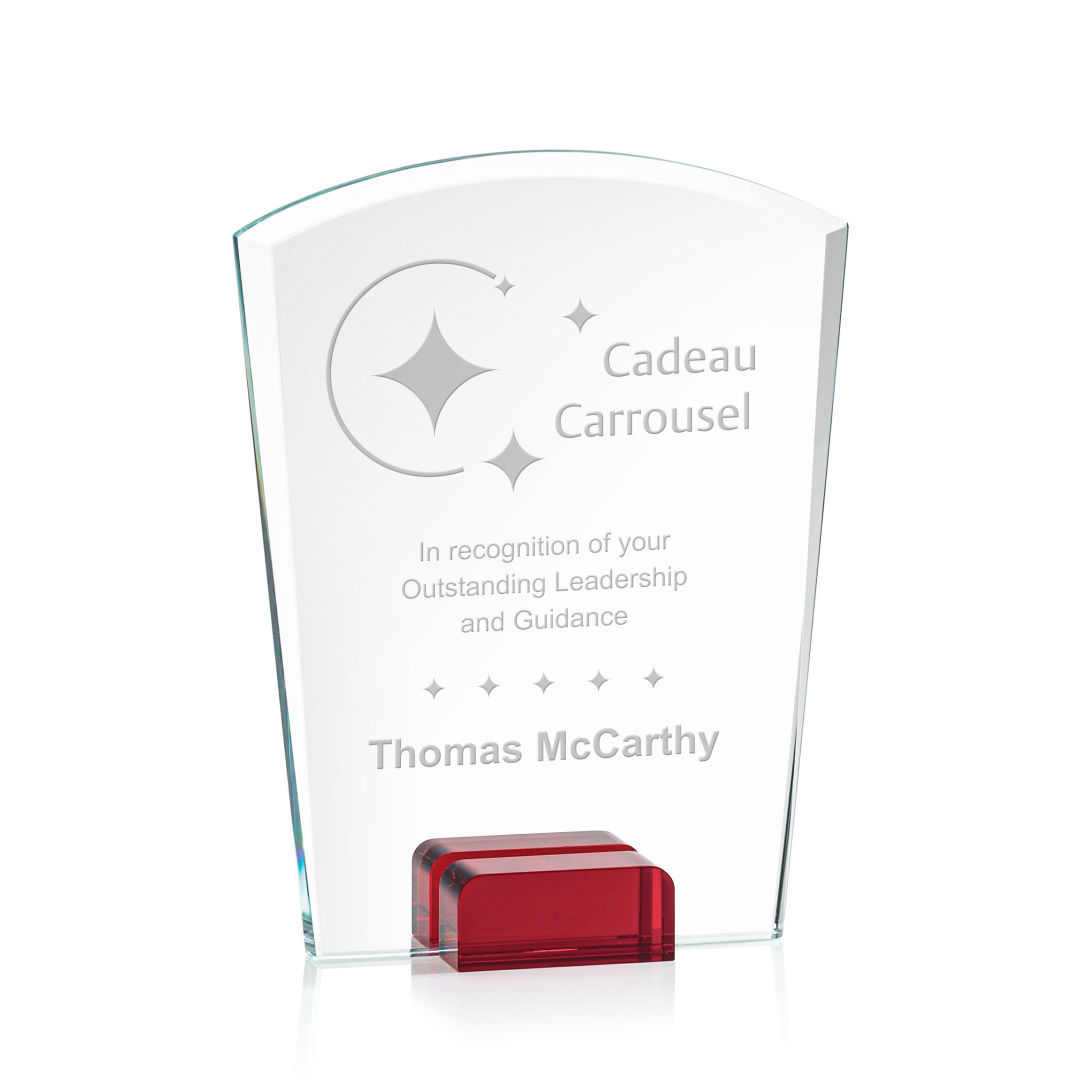 Striking Starfire Crystal Lola Award features a tapered and curved top, enhanced with a beautiful bevel and propped between two blocks of colored crystal for an stunning recognition piece to honor a special achievement. 4.0″ W x 5.75″ H