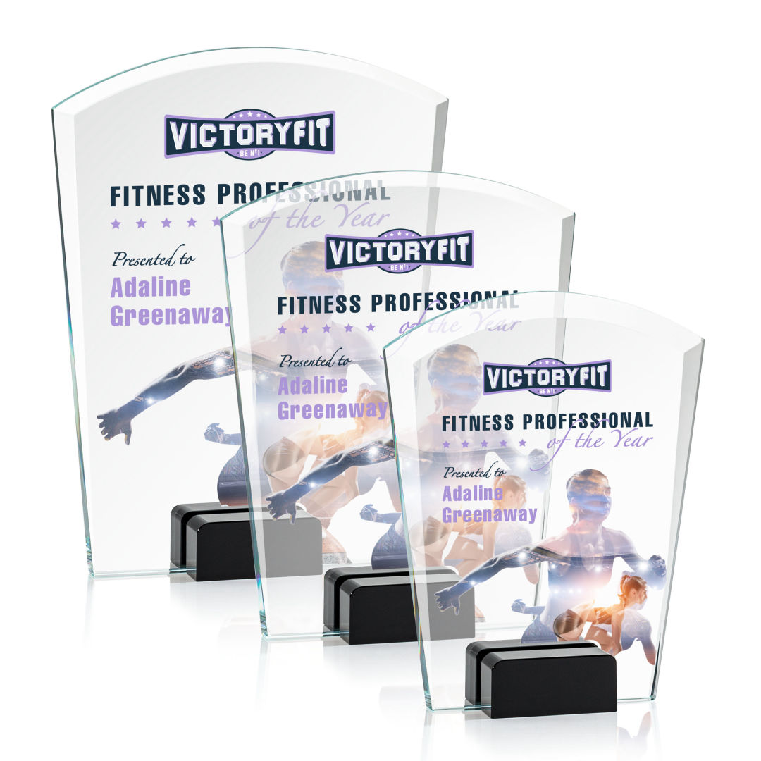 Striking Starfire Crystal Lola VividPrint™ Award features a tapered and curved top, enhanced with a beautiful bevel and propped between two blocks of colored crystal for an stunning recognition piece to honor a special achievement. 4.0″ W x 5.75″ H