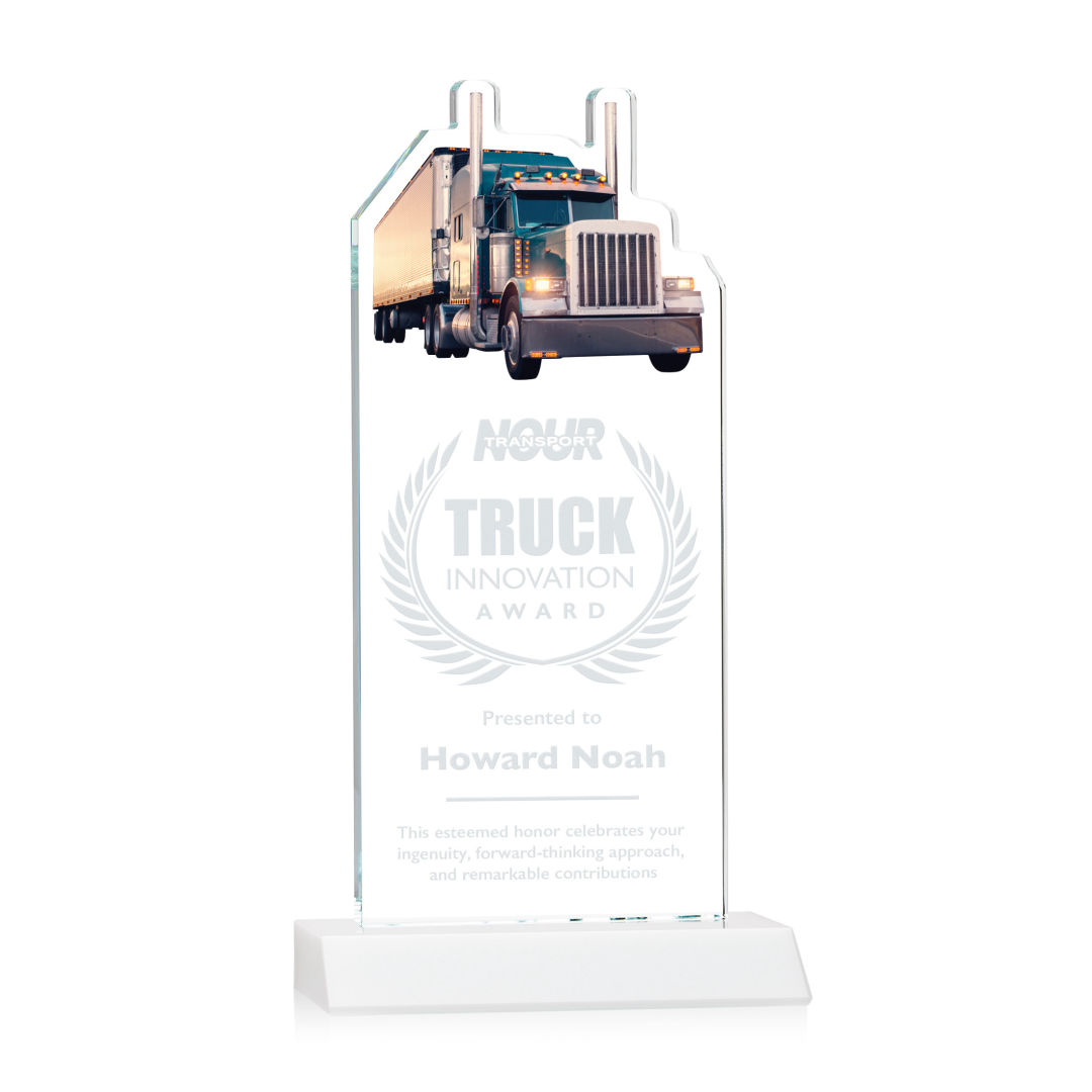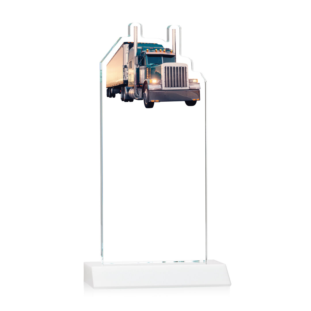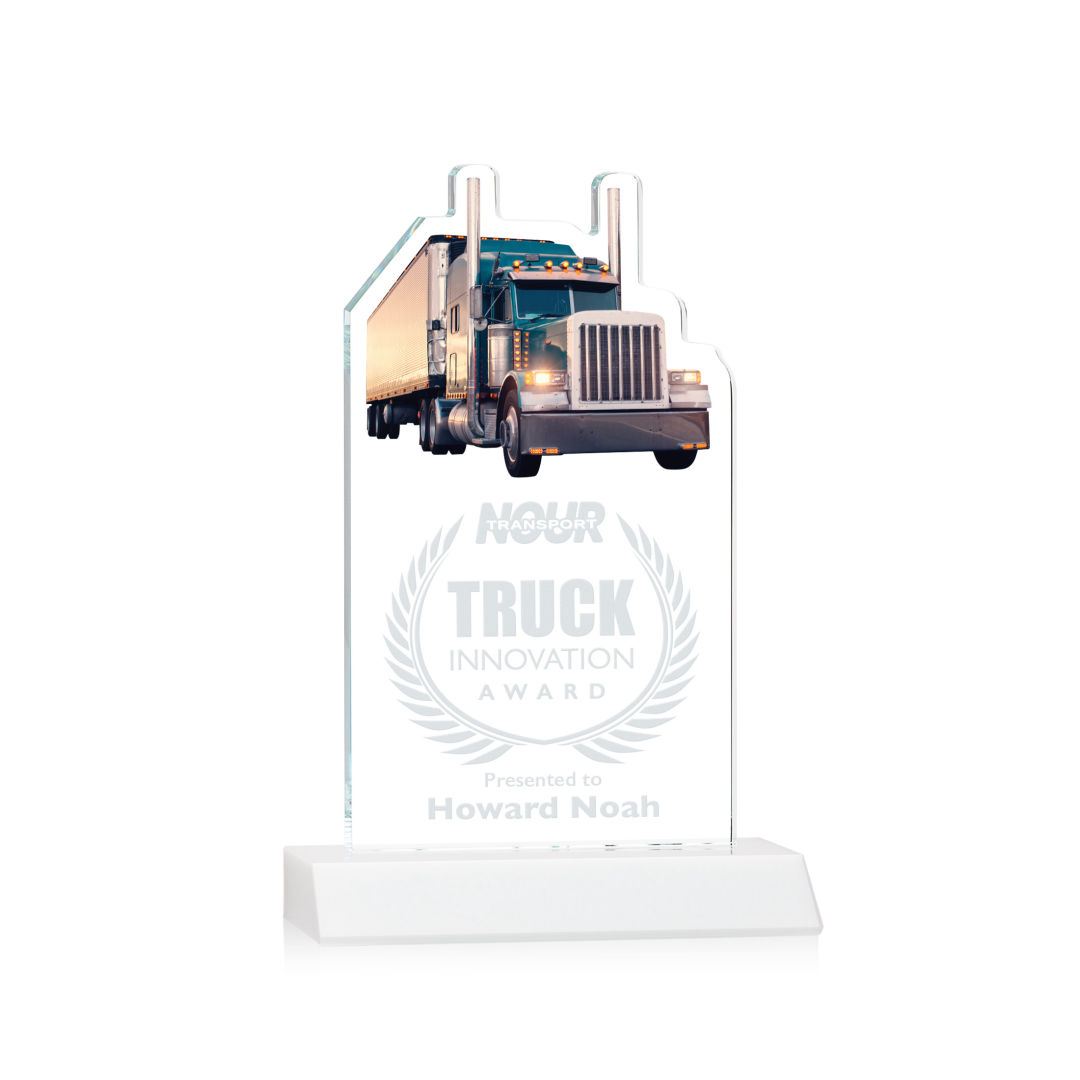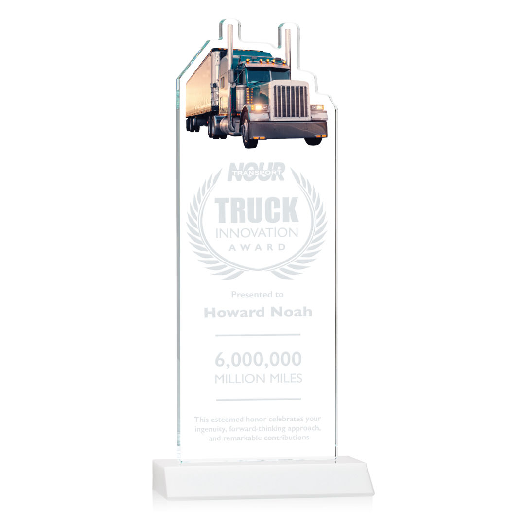 Our extraordinary Starfire Crystal Longhaul Award is a meticulously crafted piece of artistry that is a testament to the dedication and achievements within the transportation industry. This award features a finely detailed Transport Truck figure elegantly imprinted at the top and is mounted on a clear or colored Starfire Crystal front-mitered base. Its unique design embodies precision and elegance, making it a distinguished award for logistics professionals, trucking companies, or special occasions celebrating transportation excellence. Includes an imprinted image of the transport truck. Second position etch and colorfill on base optional. 5.0″ W x 7.75″ H x 3.0″ D