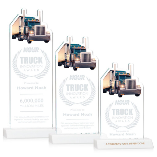 Our extraordinary Starfire Crystal Longhaul Award is a meticulously crafted piece of artistry that is a testament to the dedication and achievements within the transportation industry. This award features a finely detailed Transport Truck figure elegantly imprinted at the top and is mounted on a clear or colored Starfire Crystal front-mitered base. Its unique design embodies precision and elegance, making it a distinguished award for logistics professionals, trucking companies, or special occasions celebrating transportation excellence. Includes an imprinted image of the transport truck. Second position etch and colorfill on base optional. 5.0″ W x 7.75″ H x 3.0″ D