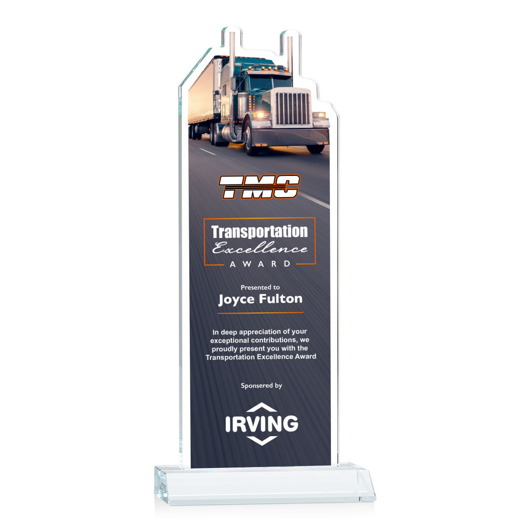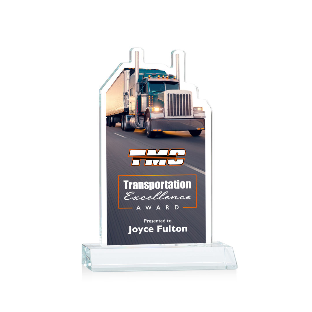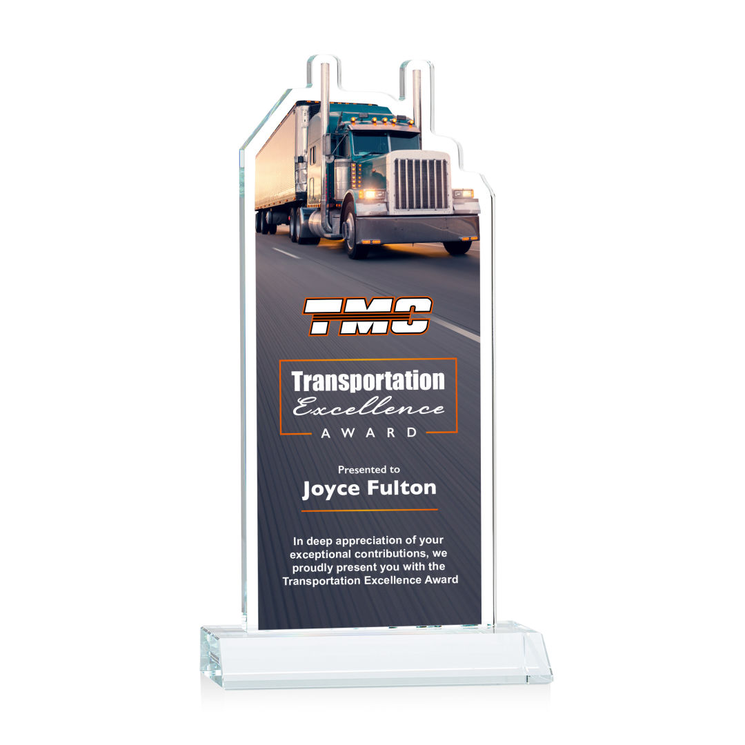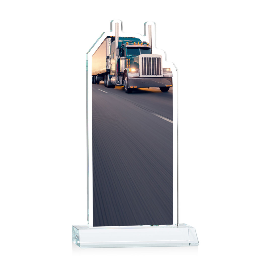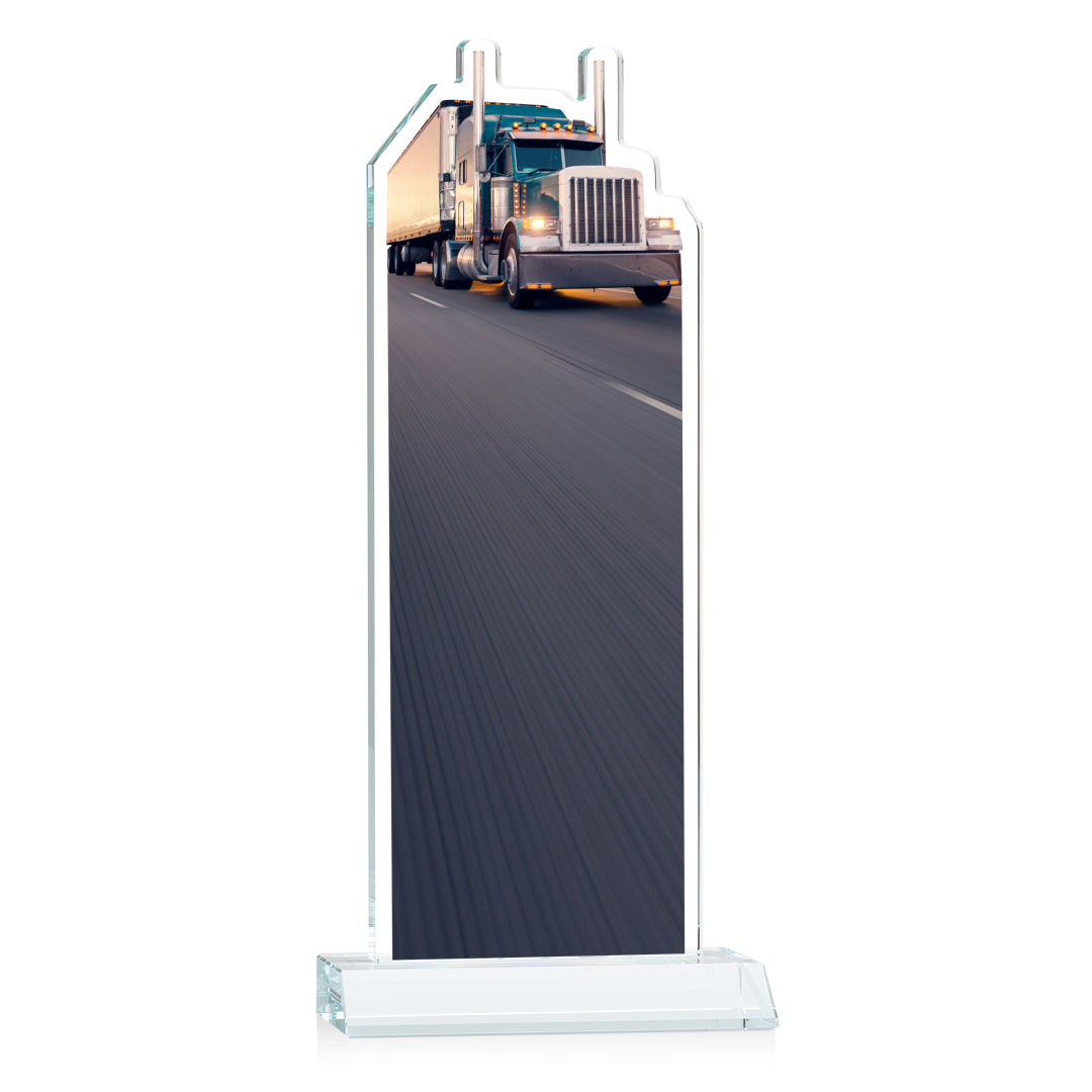 Our extraordinary Starfire Crystal Longhaul VividPrint™ Award is a meticulously crafted piece of artistry that is a testament to the dedication and achievements within the transportation industry. This award features a finely detailed Transport Truck figure elegantly carved at the top and is mounted on a clear or colored Starfire Crystal front-mitered base. Its unique design embodies precision and elegance, making it a distinguished award for logistics professionals, trucking companies, or special occasions celebrating transportation excellence. Includes imprinted image of the transport truck. Second position imprint on base optional. 5.0″ W x 7.75″ H x 3.0″ D