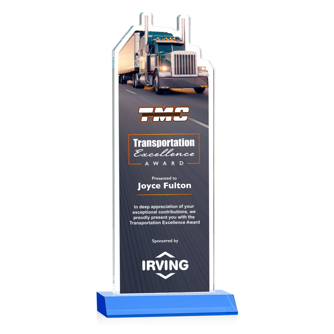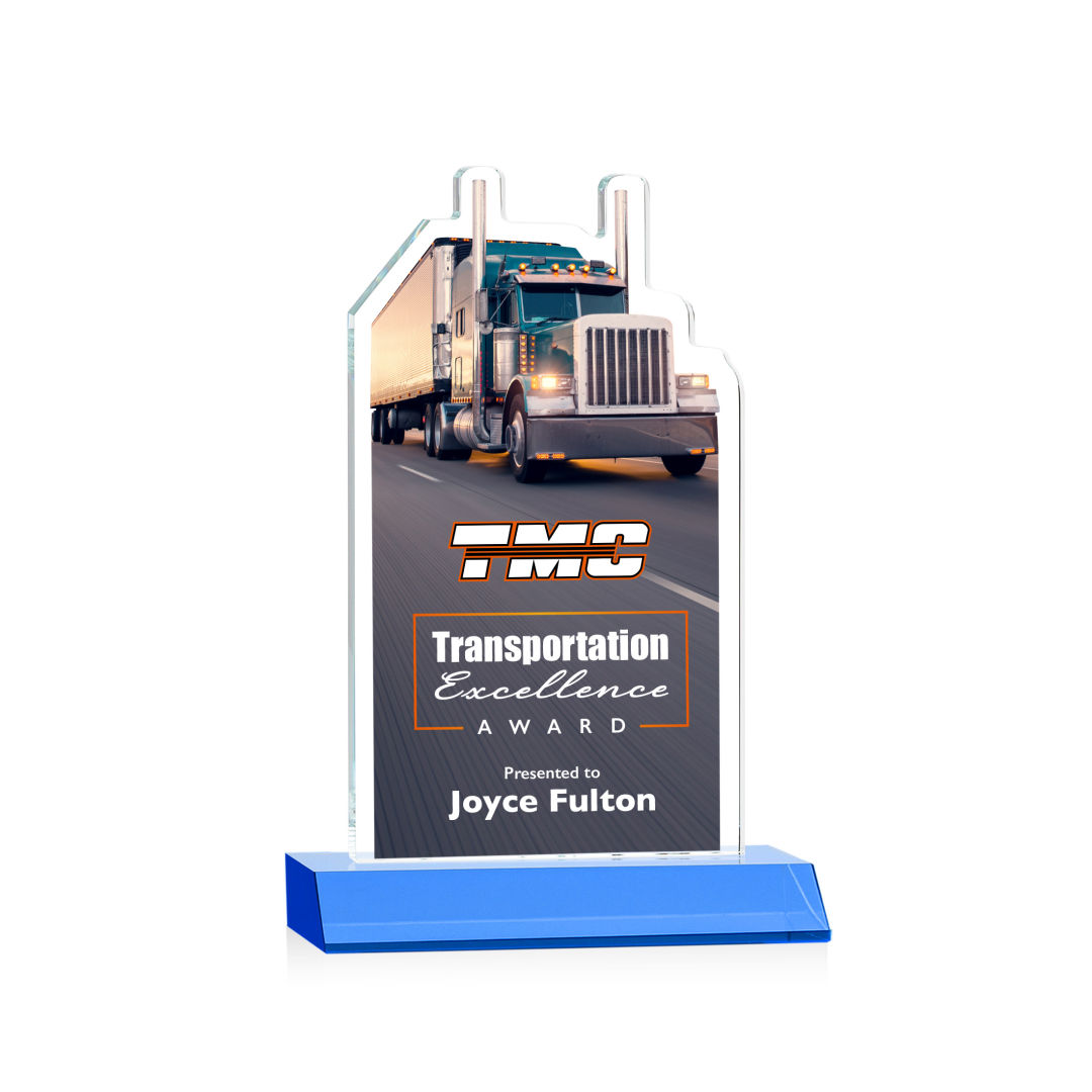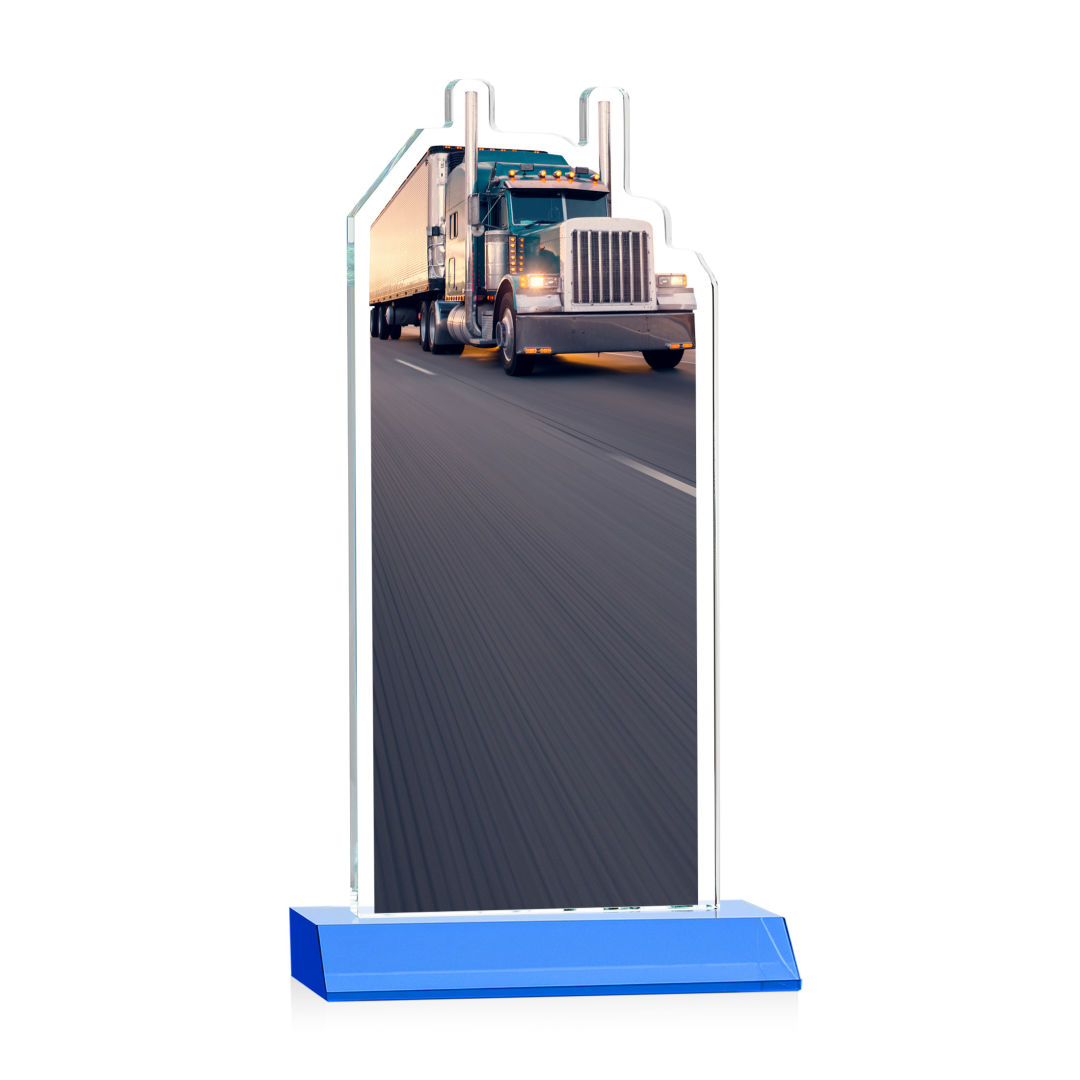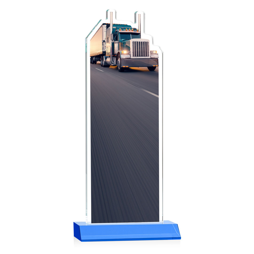 Our extraordinary Starfire Crystal Longhaul VividPrint™ Award is a meticulously crafted piece of artistry that is a testament to the dedication and achievements within the transportation industry. This award features a finely detailed Transport Truck figure elegantly carved at the top and is mounted on a clear or colored Starfire Crystal front-mitered base. Its unique design embodies precision and elegance, making it a distinguished award for logistics professionals, trucking companies, or special occasions celebrating transportation excellence. Includes imprinted image of the transport truck. Second position imprint on base optional. 5.0″ W x 7.75″ H x 3.0″ D