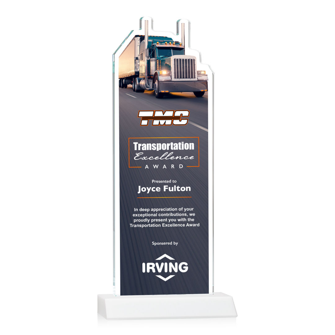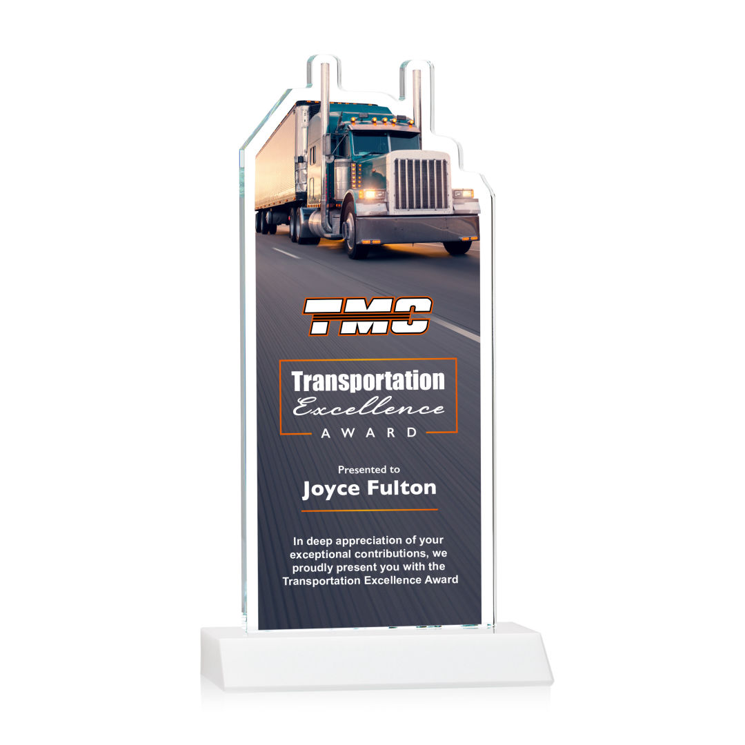 Our extraordinary Starfire Crystal Longhaul VividPrint™ Award is a meticulously crafted piece of artistry that is a testament to the dedication and achievements within the transportation industry. This award features a finely detailed Transport Truck figure elegantly carved at the top and is mounted on a clear or colored Starfire Crystal front-mitered base. Its unique design embodies precision and elegance, making it a distinguished award for logistics professionals, trucking companies, or special occasions celebrating transportation excellence. Includes imprinted image of the transport truck. Second position imprint on base optional. 5.0″ W x 7.75″ H x 3.0″ D