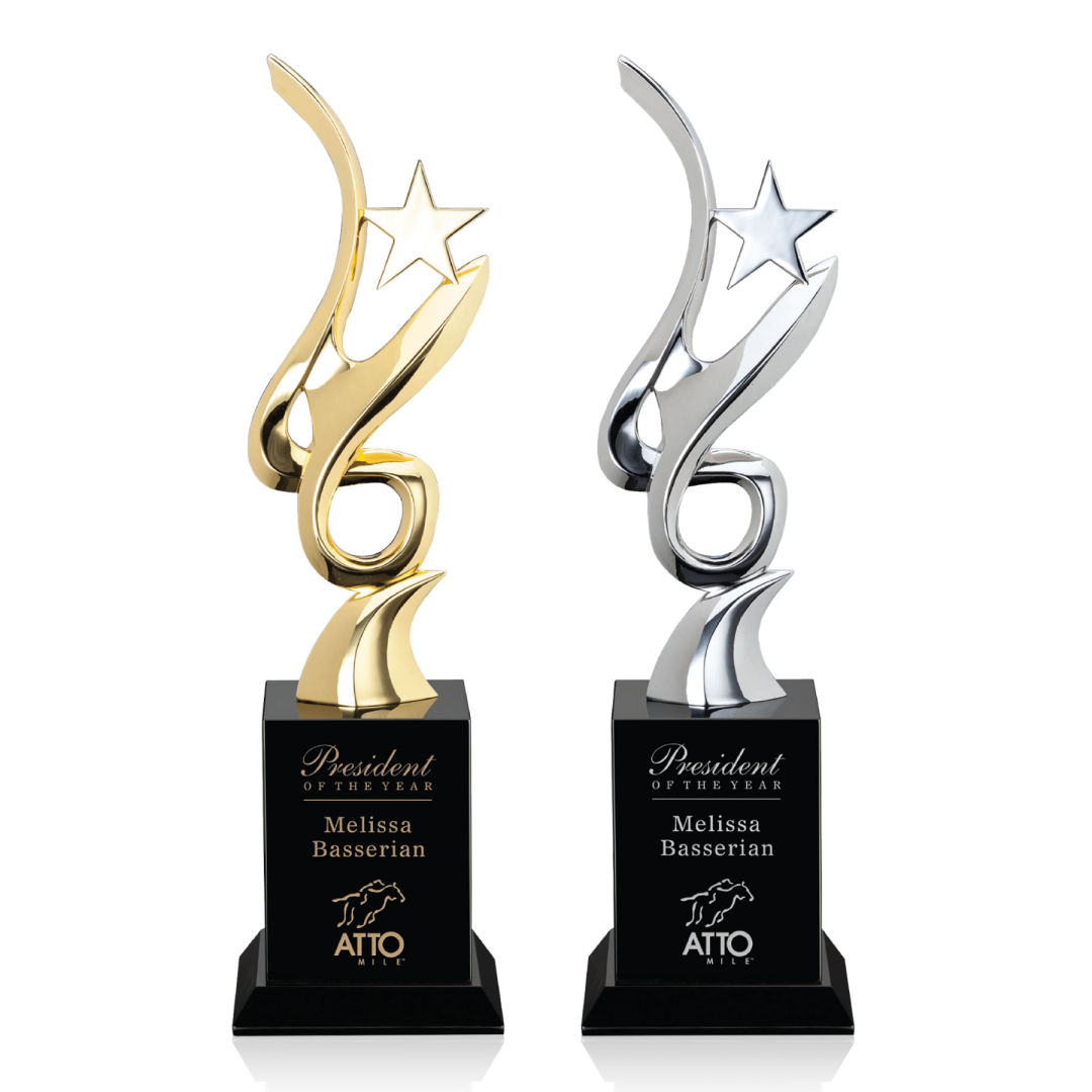 Recognize a Star Performer with this high polished creative Cast Metal award. Mounted on a tall solid Black Optical Base. Available in gold or silver.1 Colorfill Included. 12.5″ H