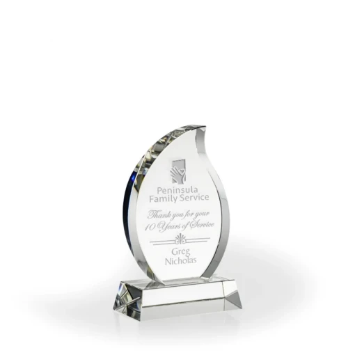 The Lucia Crystal Flame is a stunning optic crystal award and is perfect for employee or group leadership achievements. The Lucia award stands 6″ tall and comes in a presentation box. Engrave any text and your logo to fit your award title or theme. Cast a brilliant, spirited glow on every important accomplishment with this unique flame-shaped crystal award. Perfect for gas companies, fireplace manufactures, or firefighter retirement gifts or any other organization with a “flame” theme. 6″ H x 3 3/4″ W x 2″ D