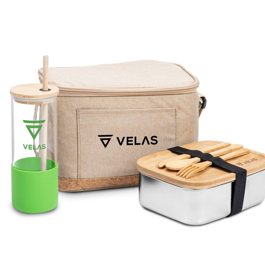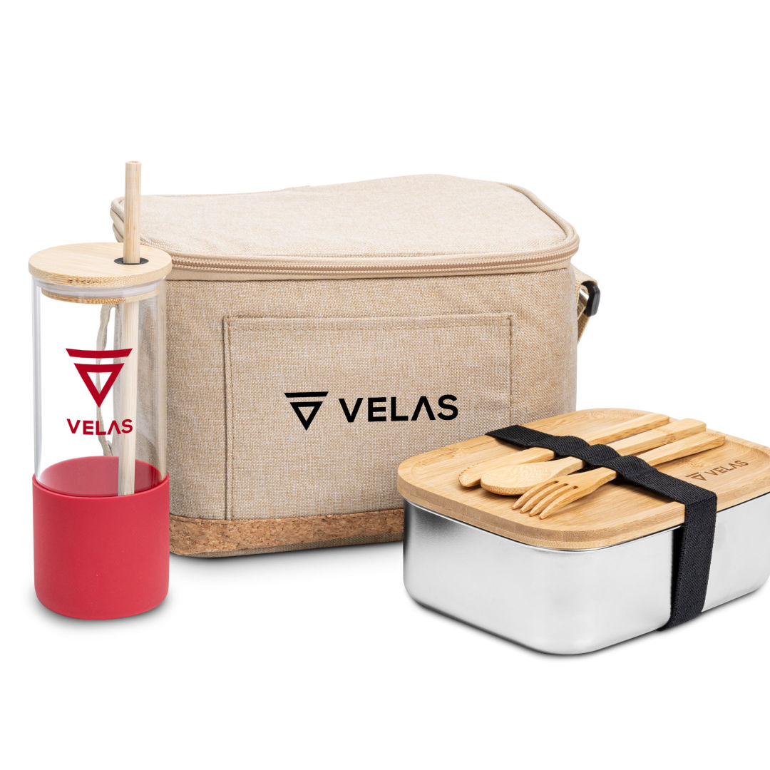 The Lunch Essentials Gift Set combines style and sustainability. This set includes a cooler lunch bag featuring a cork bottom, a glass tumbler with a bamboo lid and straw, and a stainless steel 4-piece To Go Box with a bamboo lid and utensils. This set is designed to elevate your on-the-go dining experience while reducing environmental impact. A perfect giveaway for any eco-conscious brand! 9.5″ W x 6.5″ H x 6.0″ D