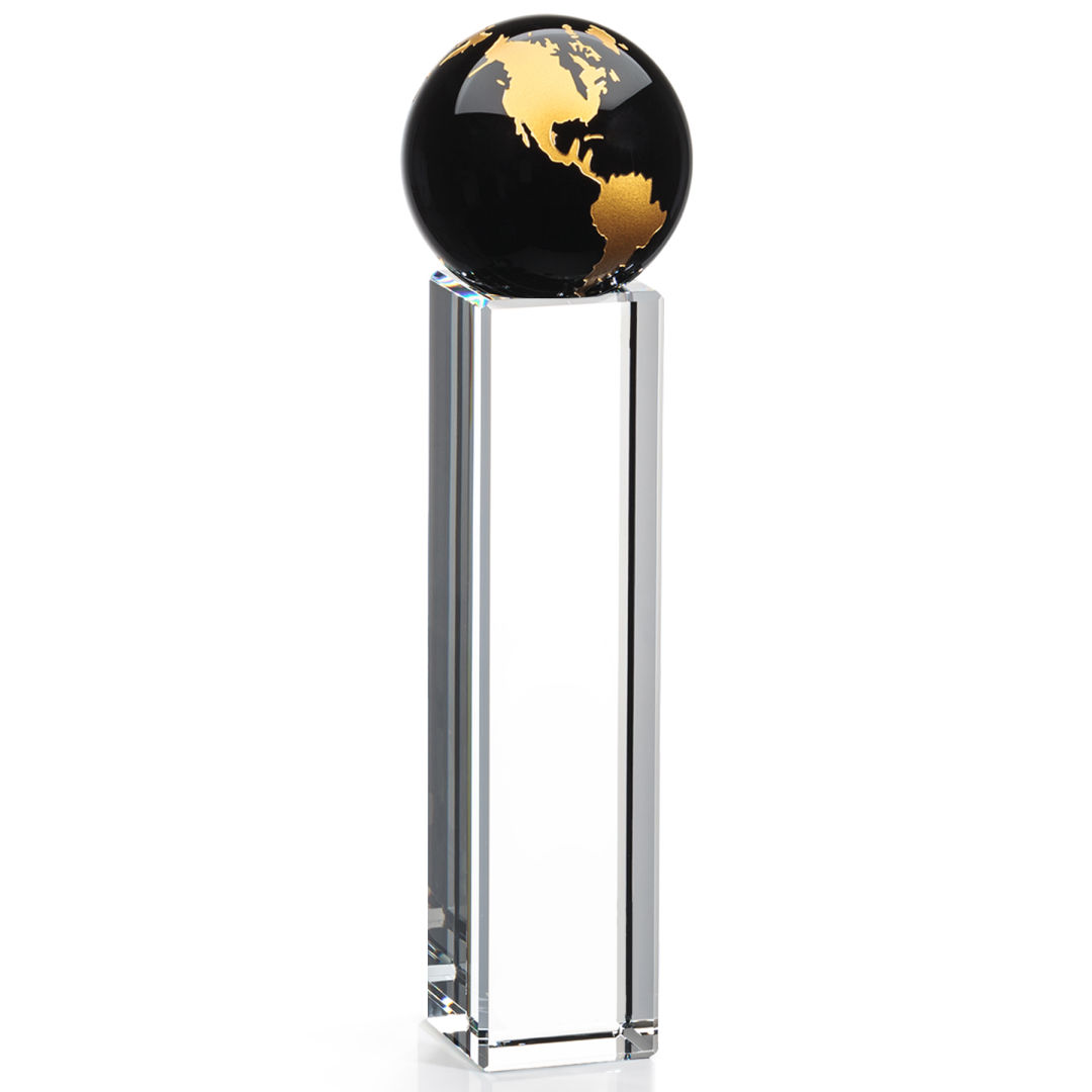 The Luz Globe award features a Black Optical Crystal globe perched on an Optical Crystal pillar. Available in gold or silver. 3.25″ W x 7.0″ H