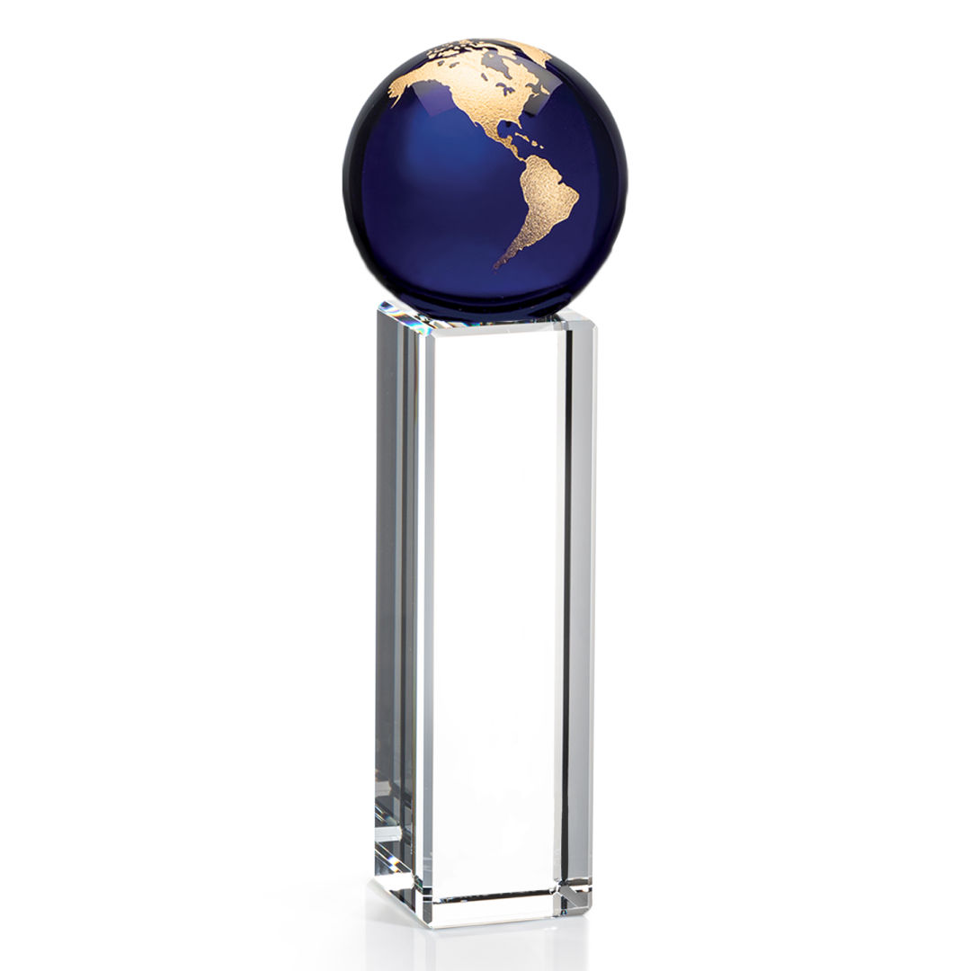 The Luz Globe award features a Blue Optical Crystal globe perched on an Optical Crystal pillar. Available in gold or silver. 3.25″ W x 7.0″ H