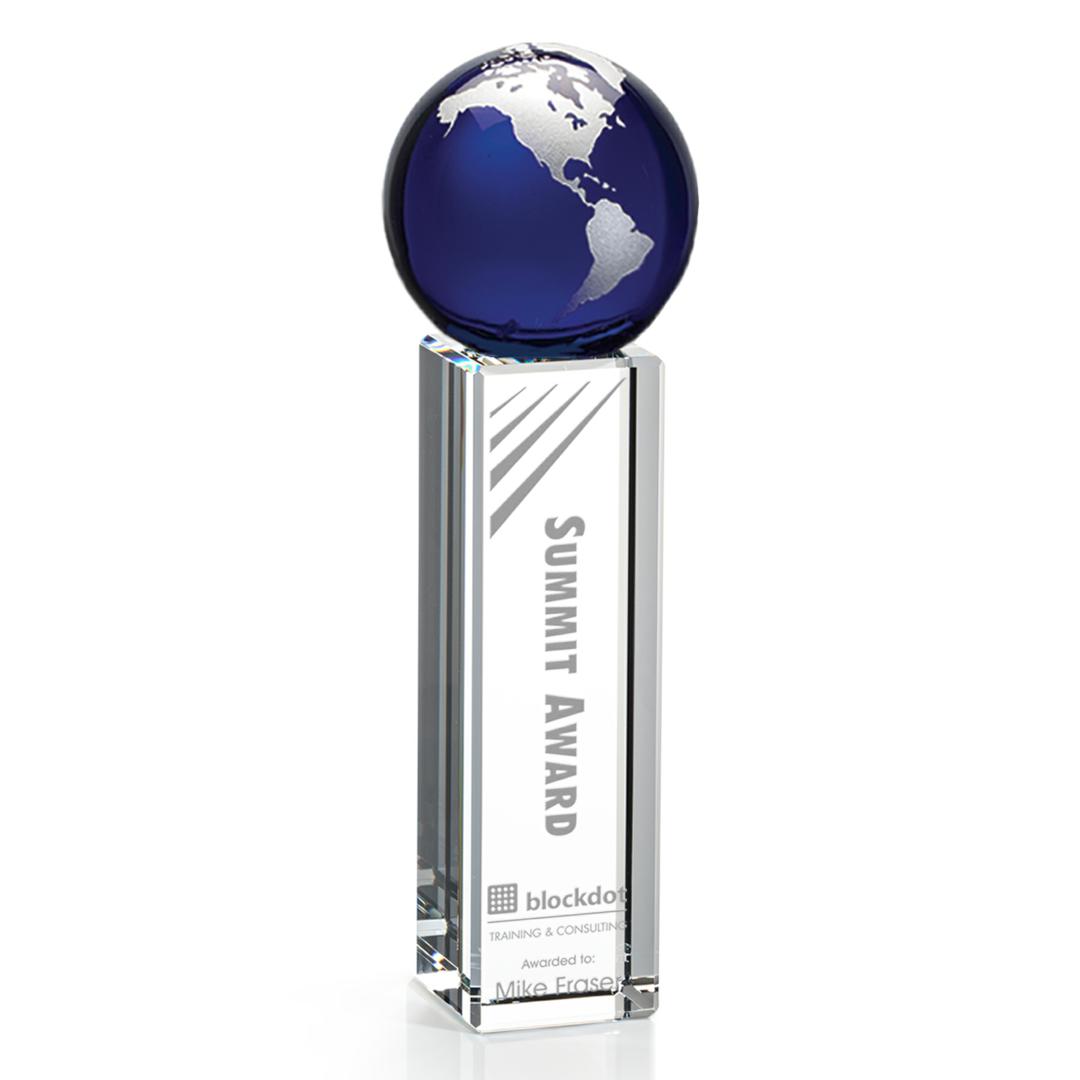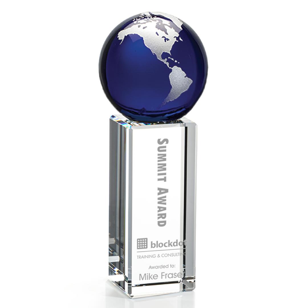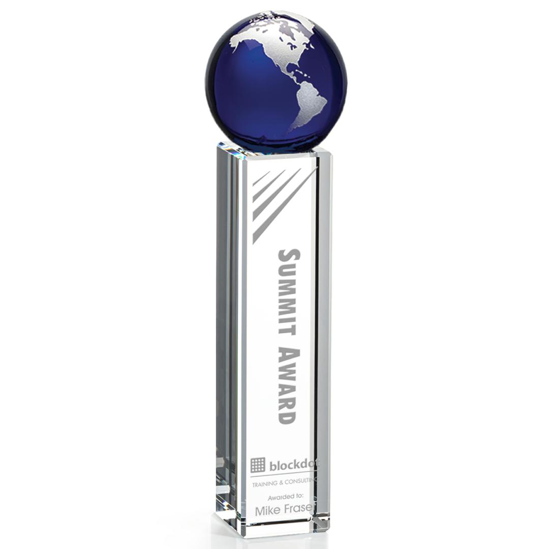 The Luz Globe award features a Blue Optical Crystal globe perched on an Optical Crystal pillar. Available in gold or silver. 3.25″ W x 7.0″ H