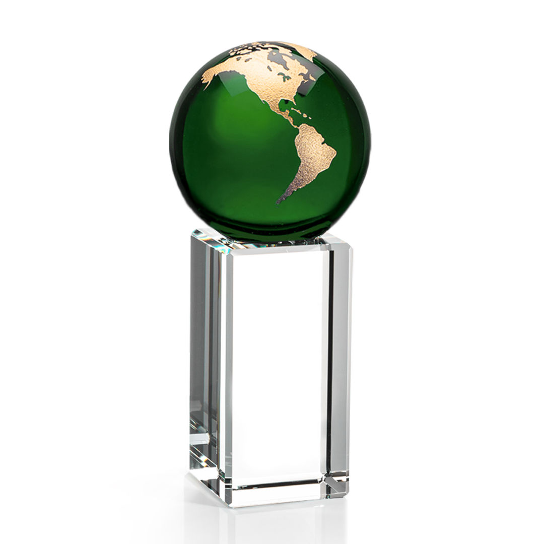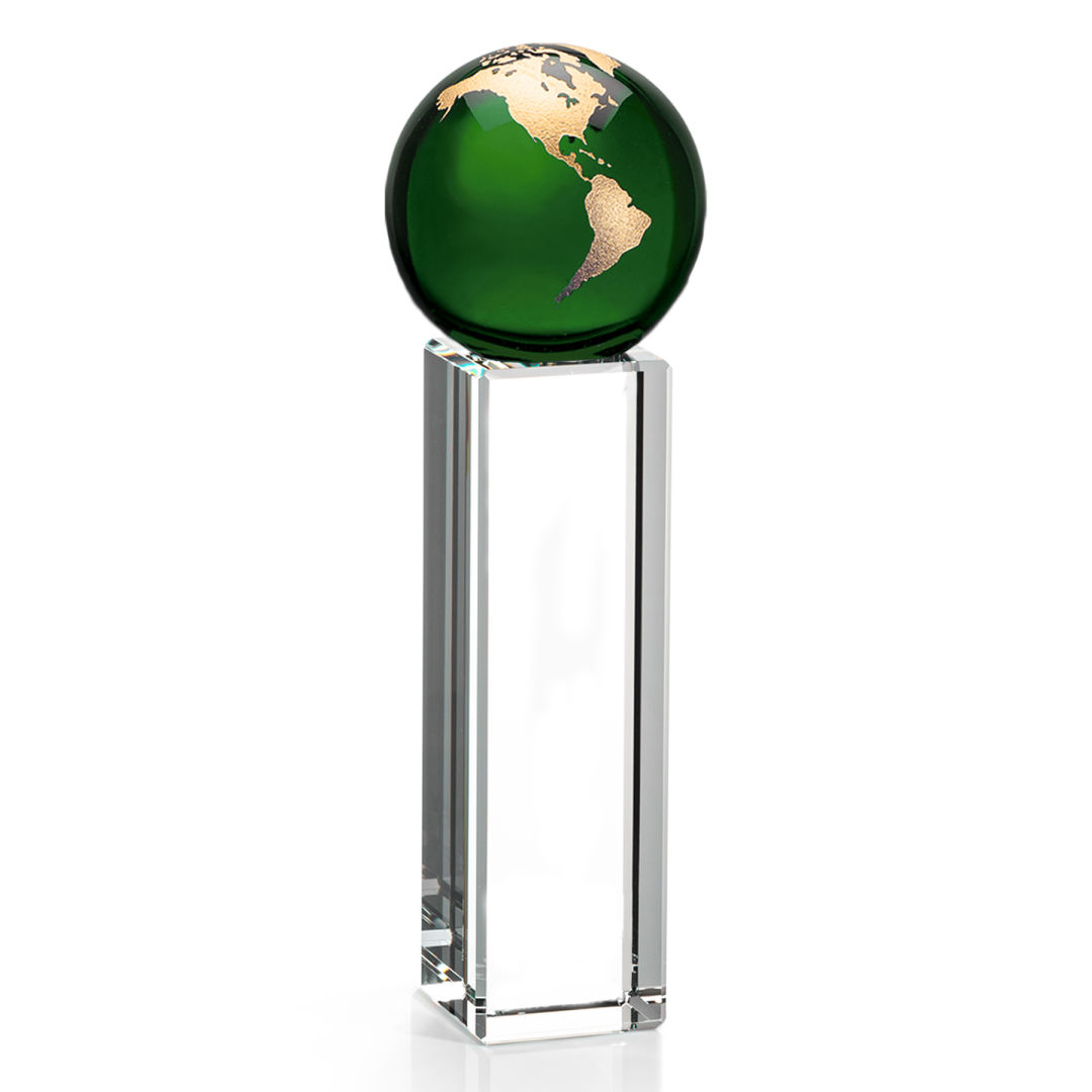 The Luz Globe award features a Green Optical Crystal globe perched on an Optical Crystal pillar. Available in gold or silver. 3.25″ W x 7.0″ H