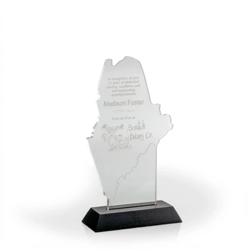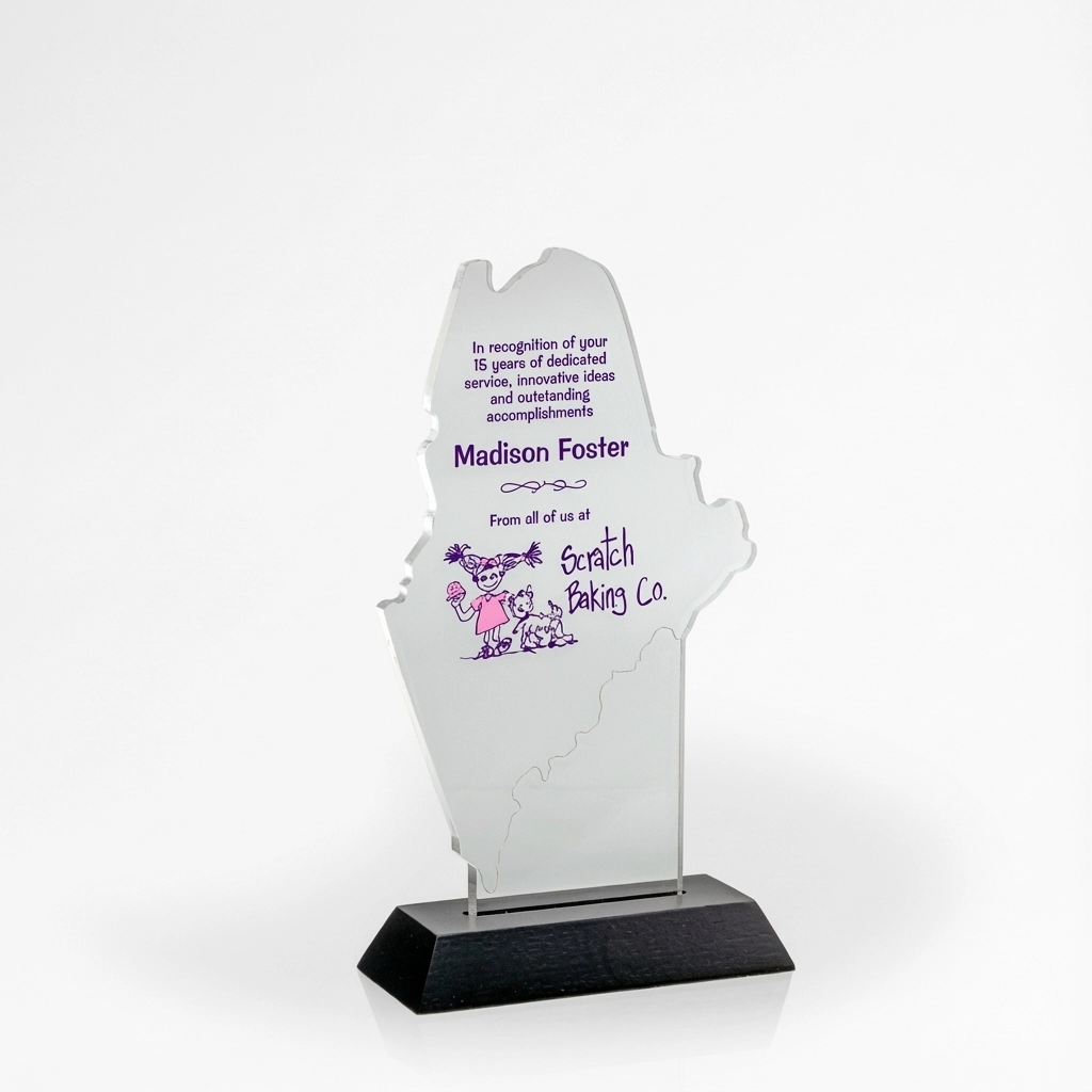 An attractive and affordable award option, our acrylic cutout awards are made in the USA with 1/4″ clear acrylic and a black, beveled wood base. These budget-friendly awards require minor assembly. The acrylic pop-in and wood base are packaged together, un-attached, in a slim-line white tri-fold box. 7.75″ H x 4.25″ W x 2″ D