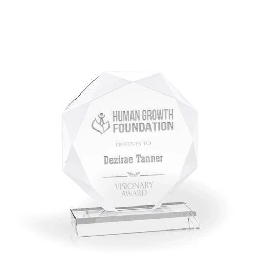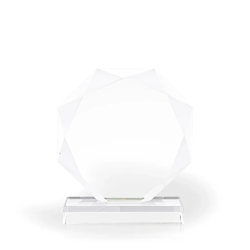 The Majestic Octagon Diamond Crystal Award is a beautiful circle shaped award with a faceted, gem-like edge. Some say it looks like the sun. This award is made of clear optic crystal and makes a great option for recognizing the contributions and achievements of your team. Available in three sizes: 6.75″ tall, 7.75″ tall, and 8.75″ tall. All sizes offer a nice amount of space for engraving your award information. 8 3/4″ H x 8″ W x 3″ D