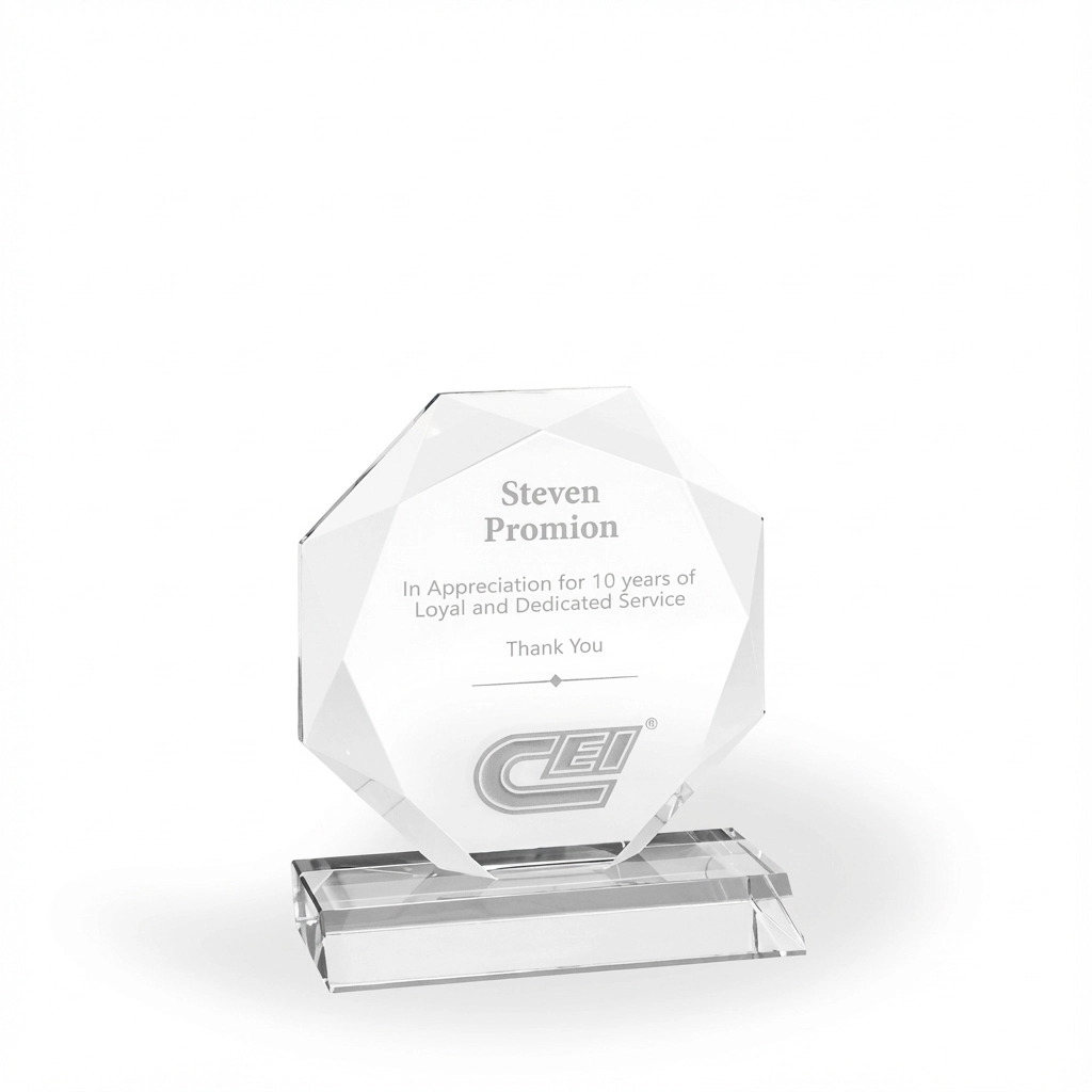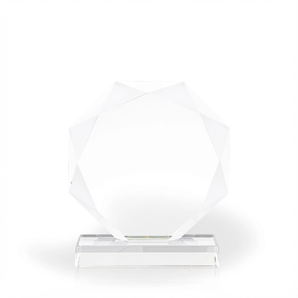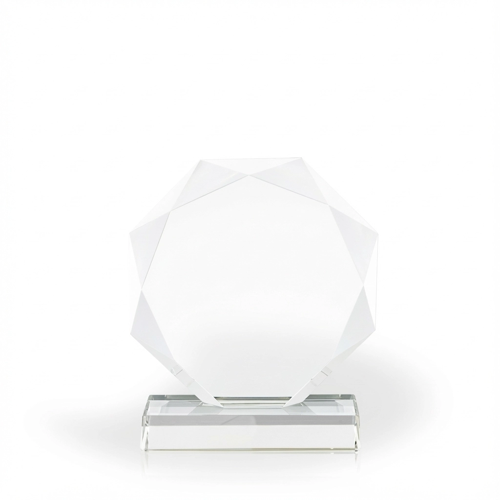 The Majestic Octagon Diamond Crystal Award is a beautiful circle shaped award with a faceted, gem-like edge. Some say it looks like the sun. This award is made of clear optic crystal and makes a great option for recognizing the contributions and achievements of your team. Available in three sizes: 6.75″ tall, 7.75″ tall, and 8.75″ tall. All sizes offer a nice amount of space for engraving your award information. 8 3/4″ H x 8″ W x 3″ D