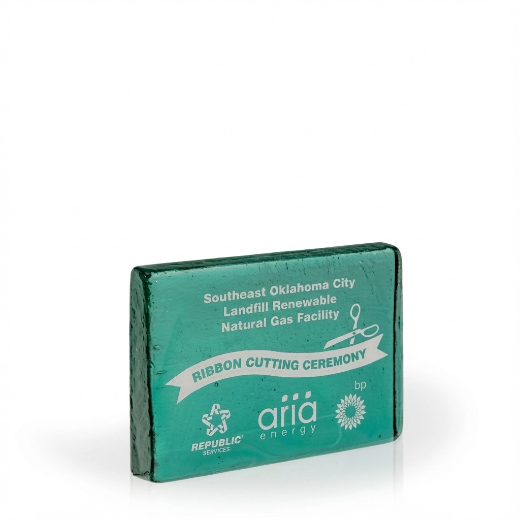 Recognize outstanding achievements with the Maldives Teal Horizontal Wedge, a truly unique and eco-conscious award. Crafted from beautifully recycled glass, this 4-inch award boasts a captivating teal hue that shimmers with depth and character, making it a distinctive symbol of accomplishment. Its sleek, horizontal wedge design offers a modern and sophisticated aesthetic, ensuring it stands out whether displayed on a desk, shelf, or mantelpiece. Each award subtly reflects the commitment to both excellence and environmental responsibility, making it an ideal choice for organizations prioritizing sustainability.