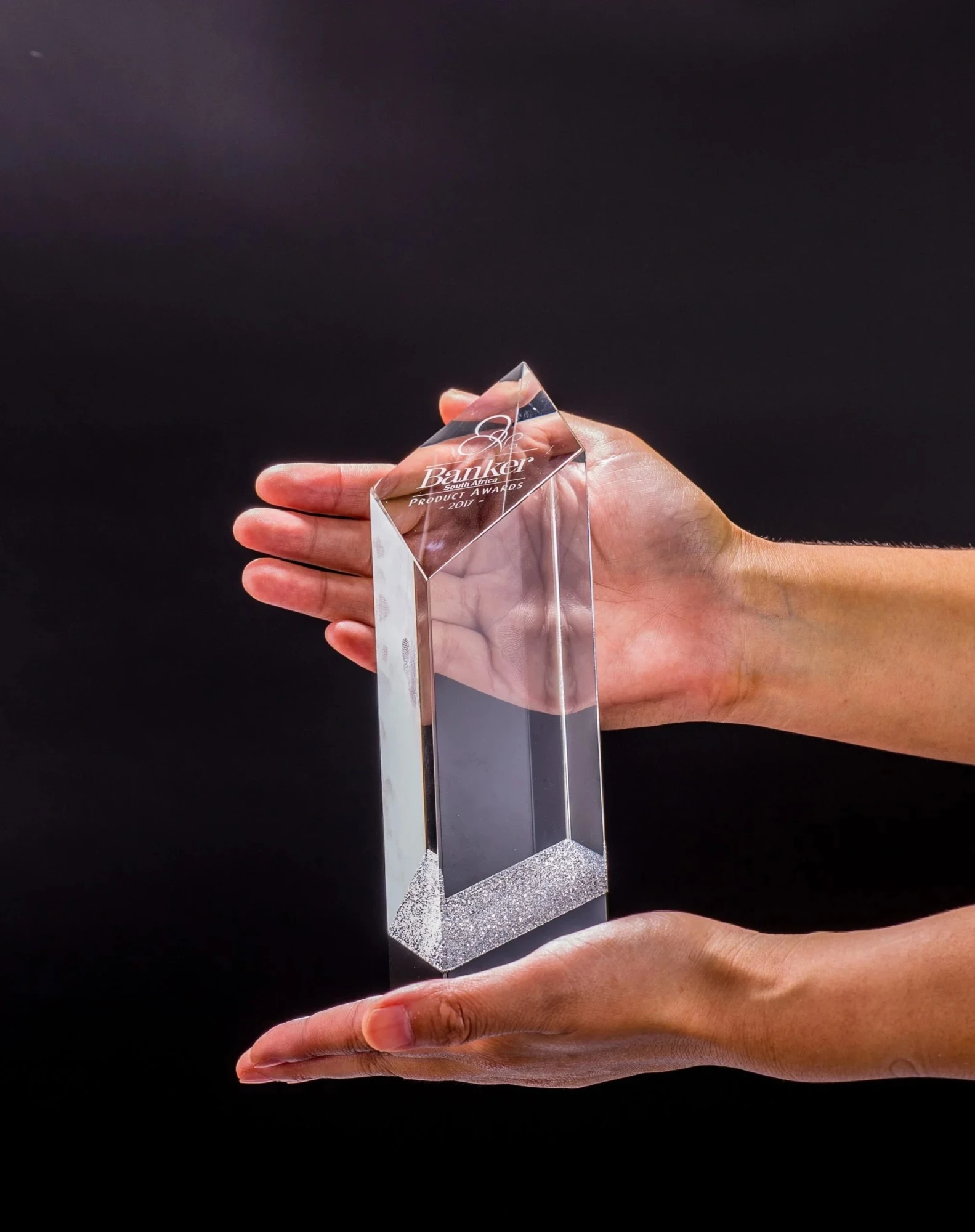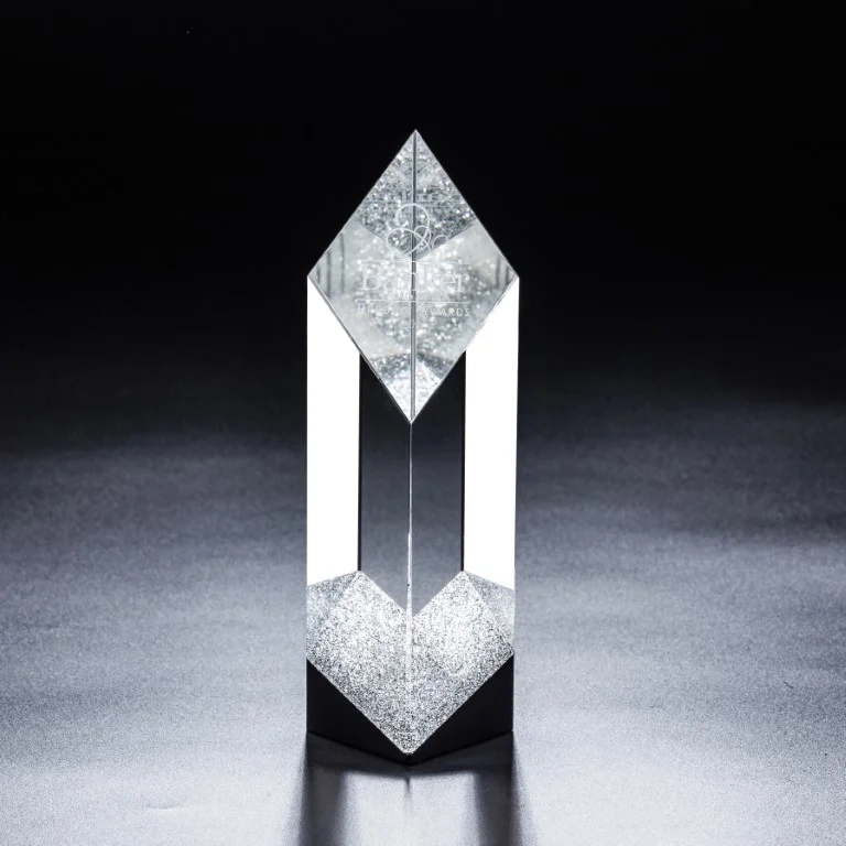 The Maleah Silver Award is created from clear optical crystal with a slanted flat surface making the top portion appear to float. Inlaid with silver dust between the tower and black crystal base. 2.4″ L x 2.4″ W x 10.6″ H