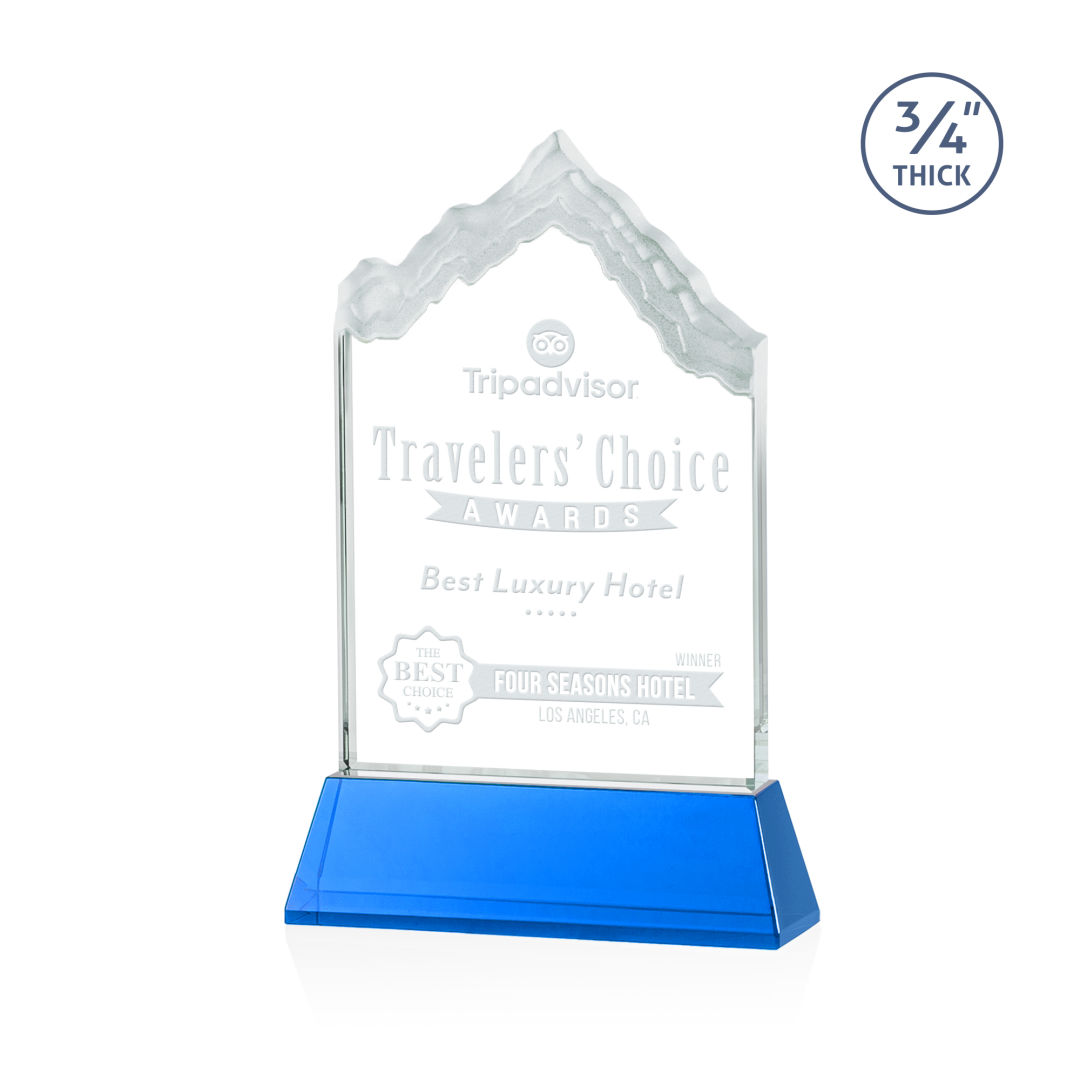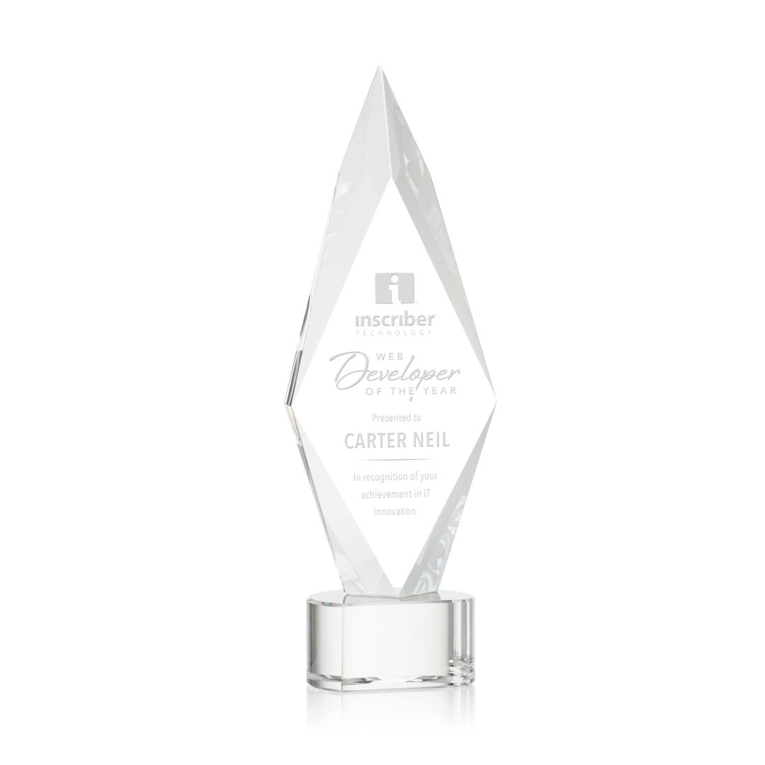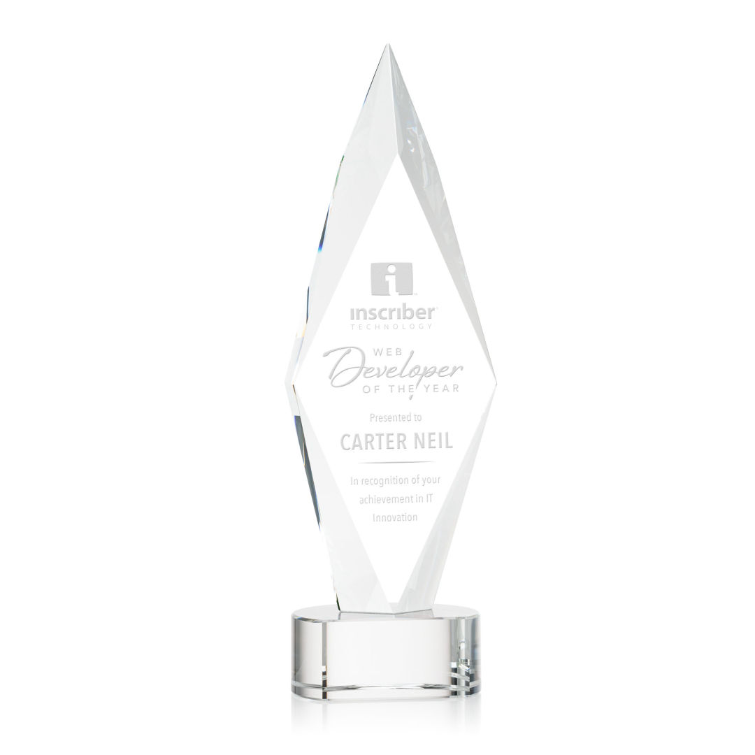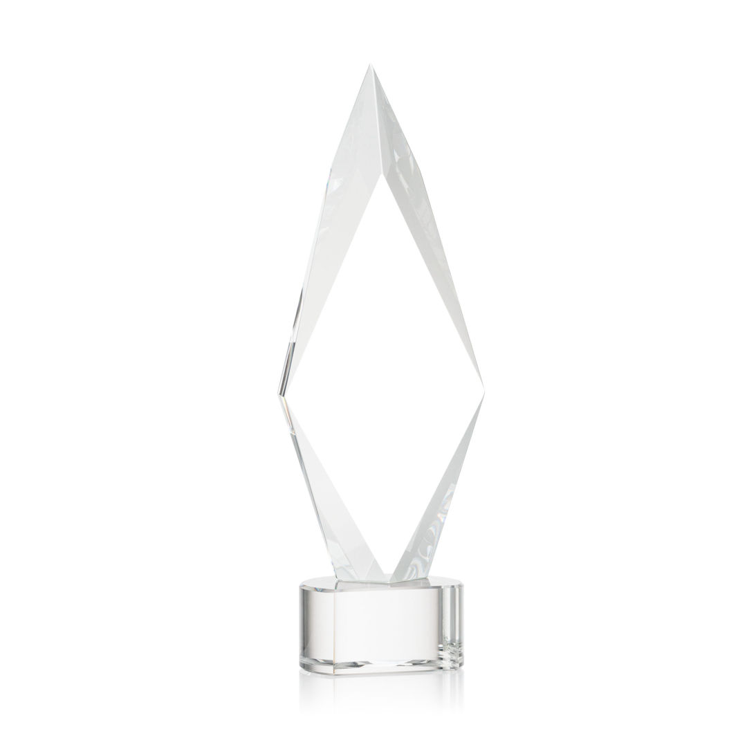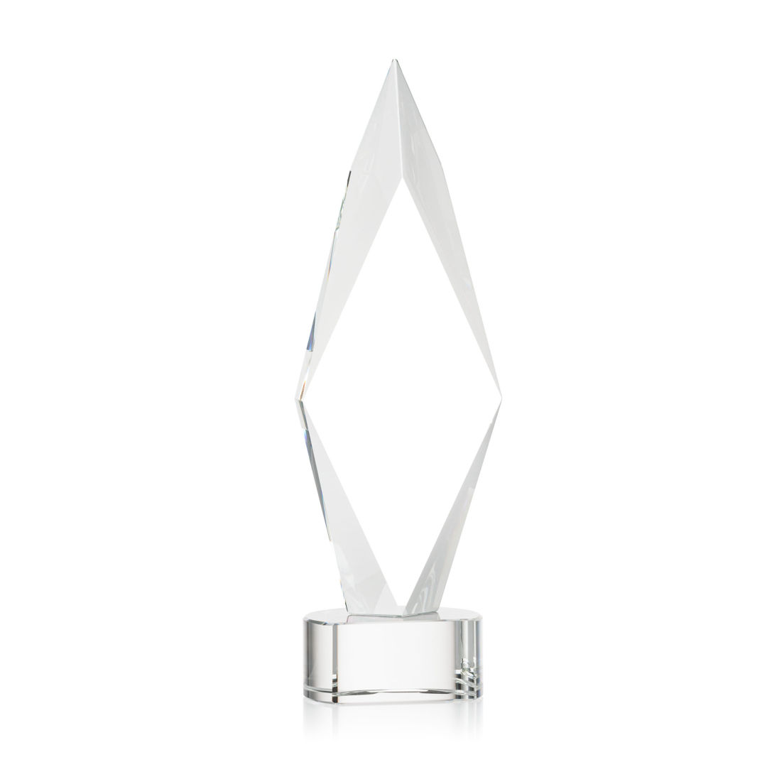 The Manilow Optical Crystal award on a Paragon base in your choice of clear, blue, green, or black. Featuring a striking arrowhead design with deep bevels that create a diamond-shaped display for your words of achievement recognition. A brilliant award to recognize an exceptional accomplishment. 3.625″ W x 10.75″ H x 2.375″ D