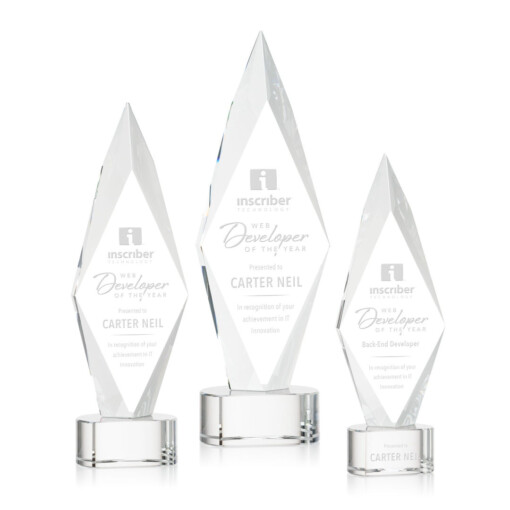 The Manilow Optical Crystal award on a Paragon base in your choice of clear, blue, green, or black. Featuring a striking arrowhead design with deep bevels that create a diamond-shaped display for your words of achievement recognition. A brilliant award to recognize an exceptional accomplishment. 3.625″ W x 10.75″ H x 2.375″ D
