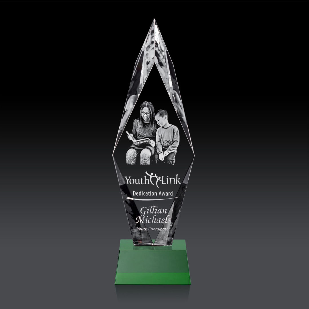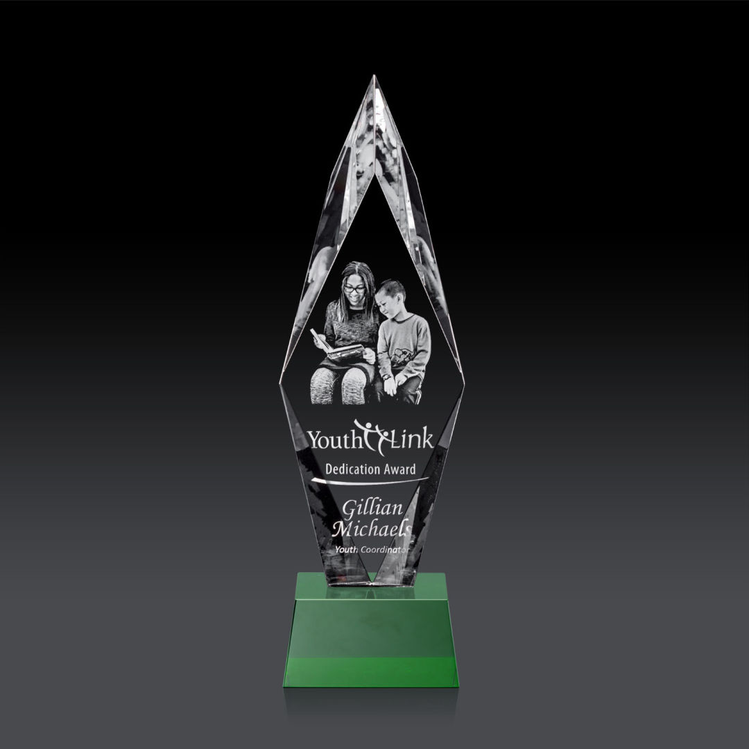 This beautifully beveled, arrowhead-shaped Manilow Optical Crystal award is mounted on our tapered Robson Crystal Base in your choice of Clear, Black, Blue or Green. Turn your award into a magnificent work of art with Dimensions 3D subsurface etch. Our 3D Pop process creates a simulated 3D effect from a 2D photo. For a true 3D engraving, please provide a 3D engraving file (.obj), or we can redraw it for a fee. 3.625″ W x 11.25″ H x 3.25″ D