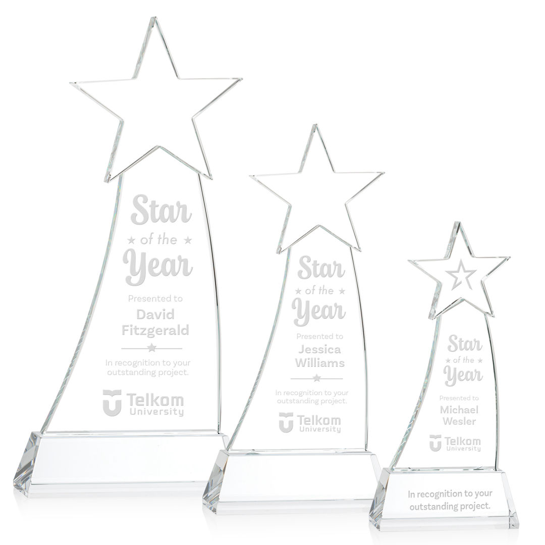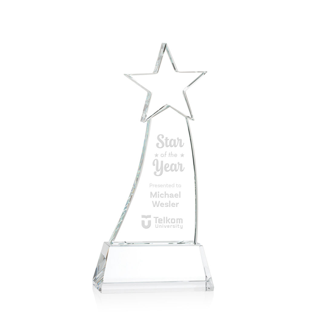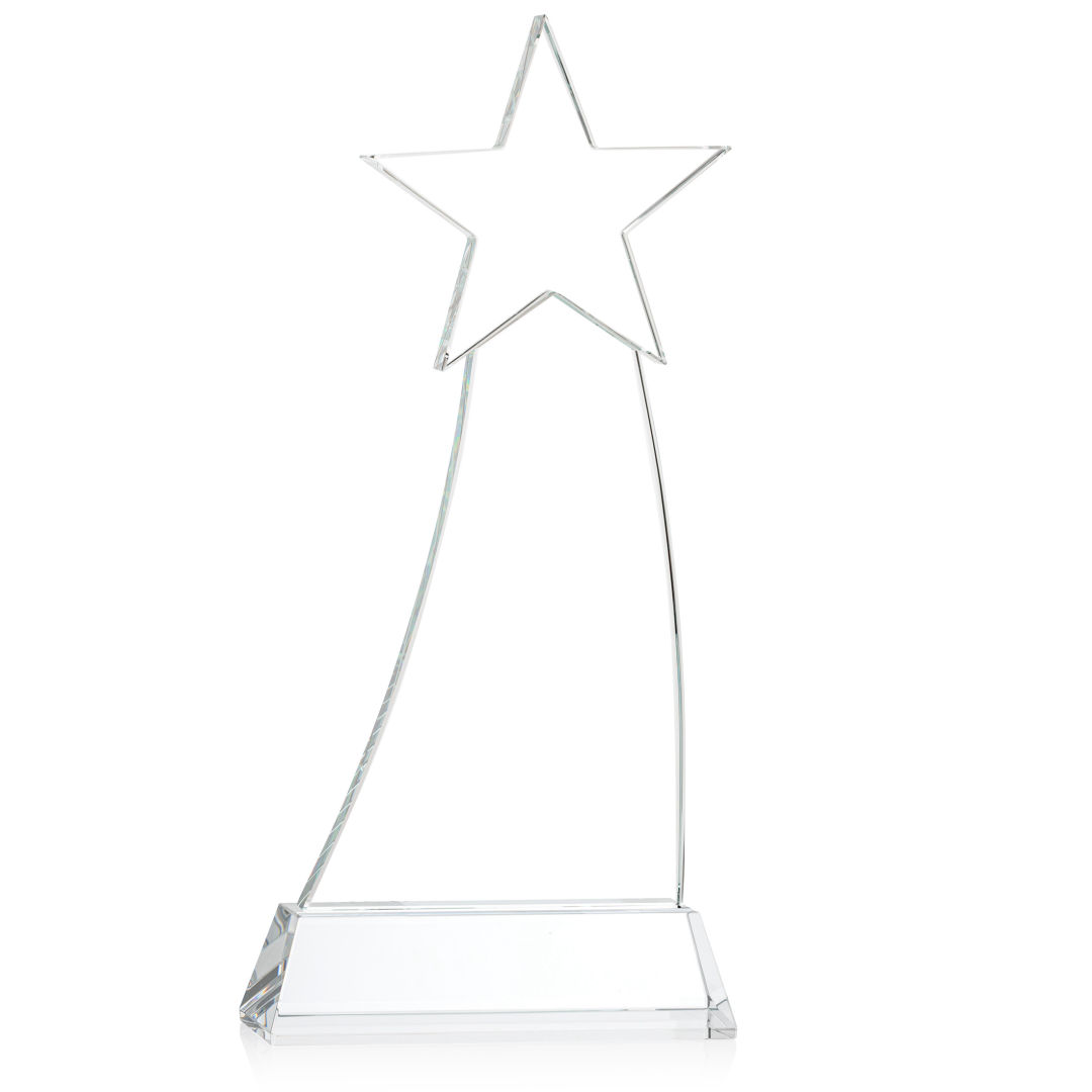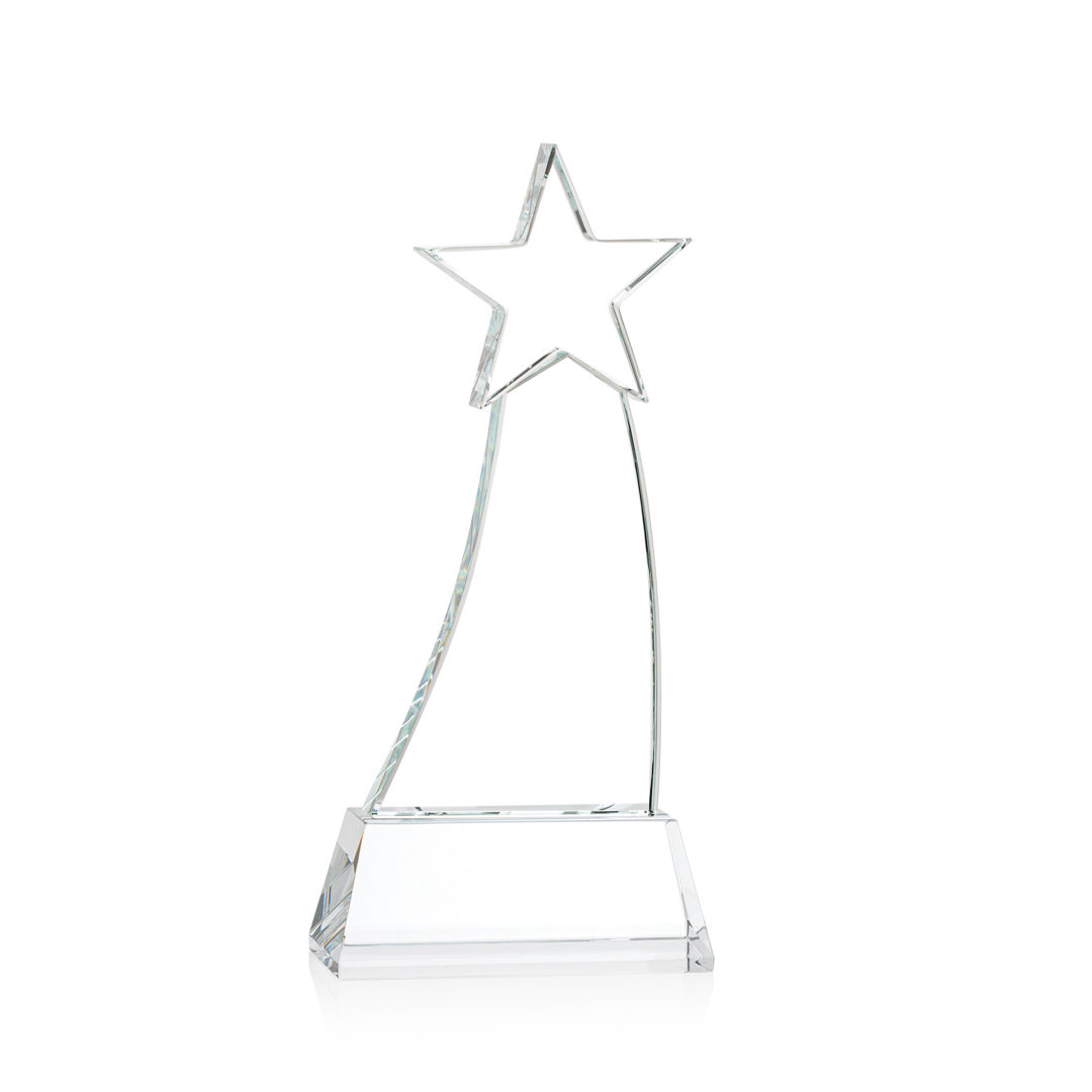 Crafted from premium Optical Crystal, the Manolita Star Award boasts a flawless clarity that refracts light with captivating brilliance. Its gracefully curved shape adds a modern touch, while the star at the pinnacle crowns the achievement with celestial significance. Mounted on your choice of clear or colored Optical Crystal Base. Packaged in a black satin-lined presentation gift box. Second and third position etch optional. 4.0″ W x 8.5″ H x 2.0″ D