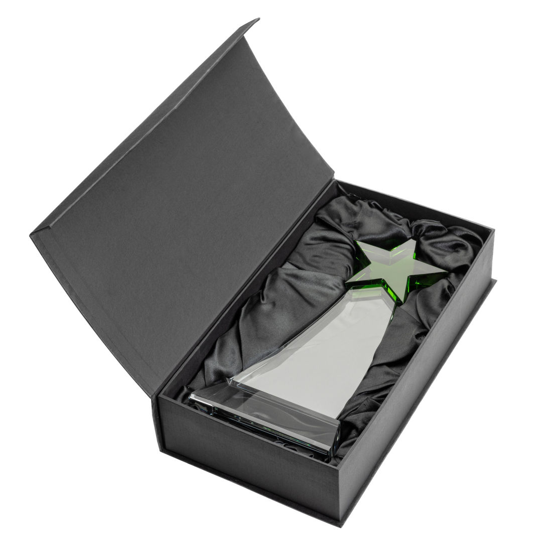 Reach for the stars with our Manolita Star Award. Magnificent optical crystal adorned with a large Emerald optical crystal star mounted on a your choice of Clear, Emerald or Ebony optical base. Colorfill & 2nd Position Etch Optional. 4.0″ W x 8.5″ H x 2.0″ D