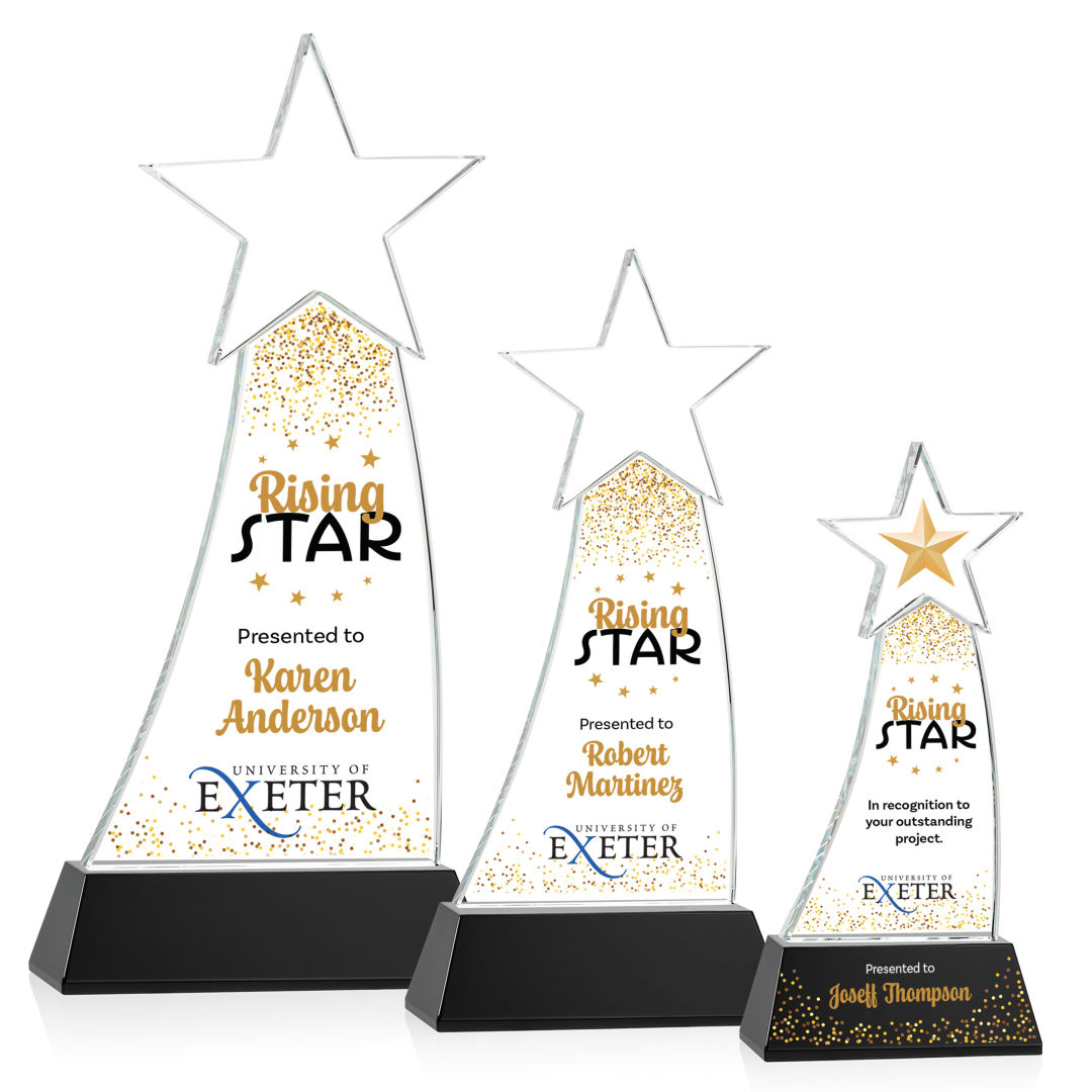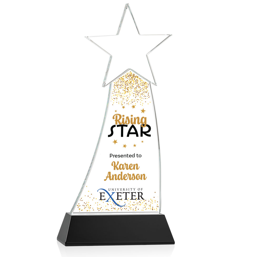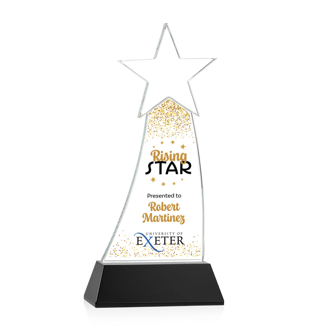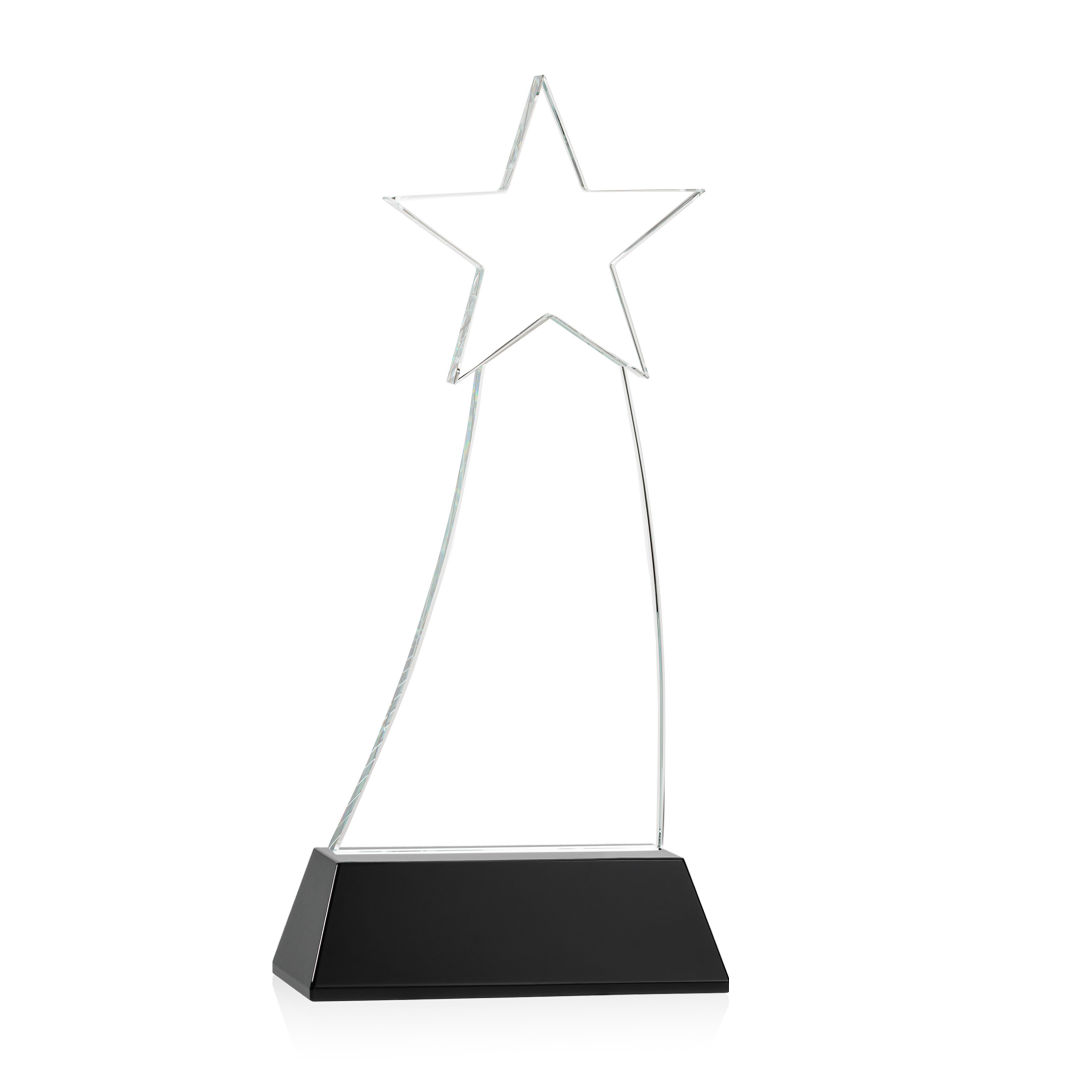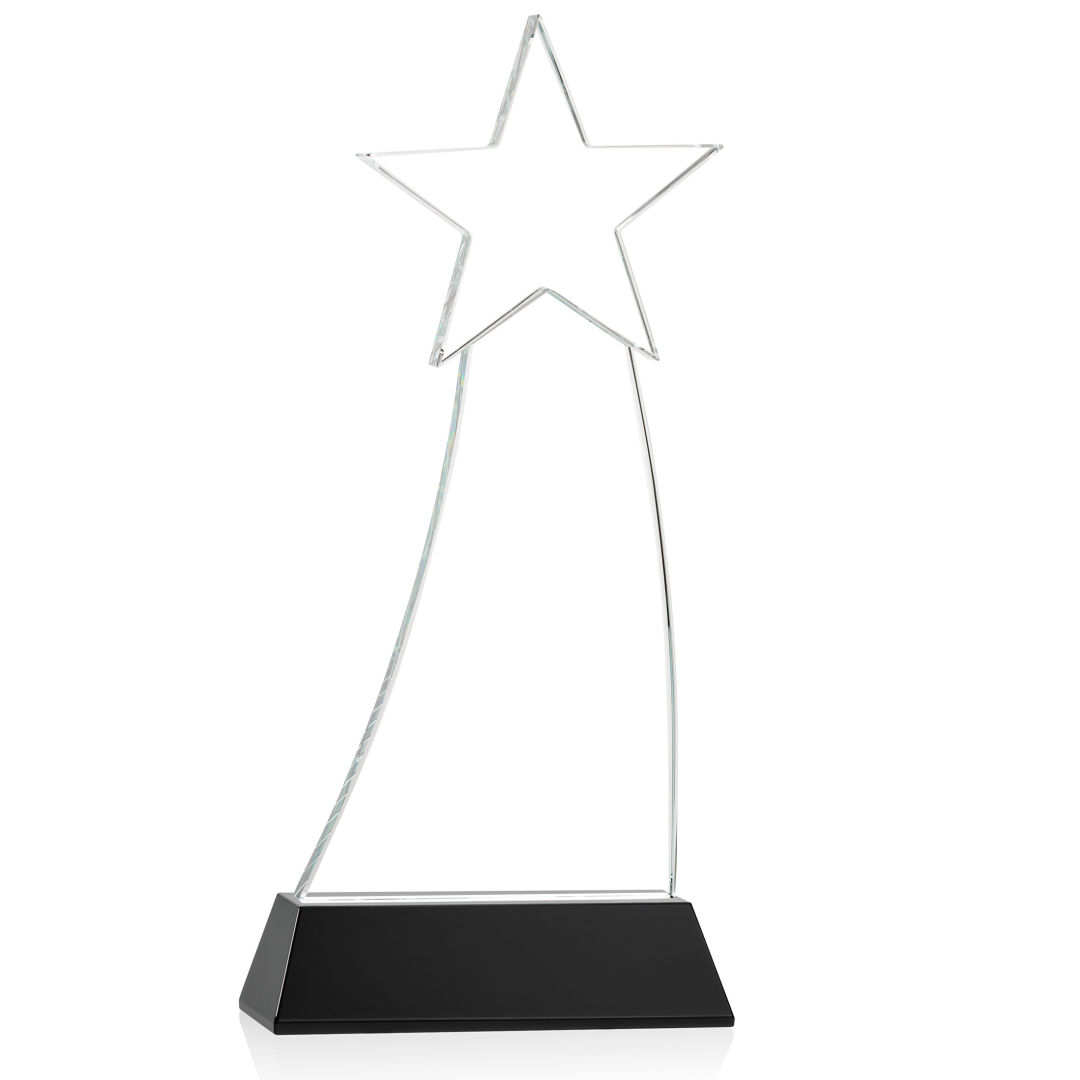 Crafted from premium Optical Crystal, the Manolita Star VividPrint™ Award boasts a flawless clarity that refracts light with captivating brilliance. Its gracefully curved shape adds a modern touch, while the star at the pinnacle crowns the achievement with celestial significance. Mounted on your choice of clear or colored Optical Crystal Base. Packaged in a black satin-lined presentation gift box. Second and third position imprint optional. 4.0″ W x 8.5″ H x 2.0″ D