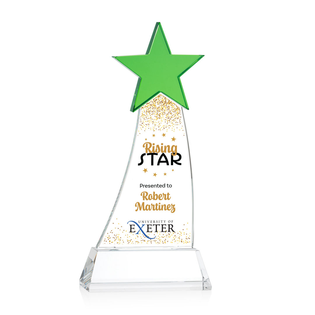 Reach for the stars with our Manolita VividPrint™ Award. Magnificent optical crystal adorned with a large Emerald optical crystal star mounted on a your choice of Clear, Emerald or Ebony optical base. Second position imprint optional. Let your message shine with full-color VividPrint™! 4.0″ W x 8.5″ H x 2.0″ D
