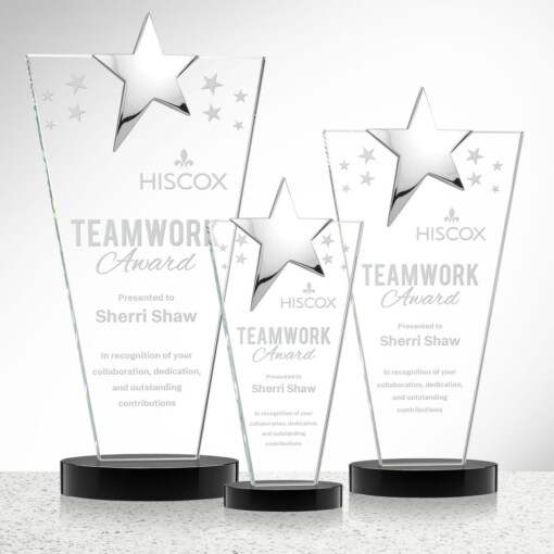 The Optical Crystal Mantella Star Award features a sleek tapered rectangle design accented by a brilliant chrome or gold star at the top. Mounted on a clear oval optical crystal base, this award radiates prestige and celebrates stellar achievement. 3.625″ W x 7.5″ H x 2.75″ D