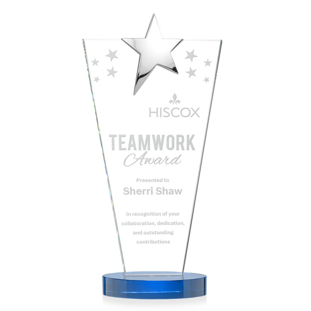 The Optical Crystal Mantella Star Award features a sleek tapered rectangle design accented by a brilliant chrome or gold star at the top. Mounted on a clear oval optical crystal base, this award radiates prestige and celebrates stellar achievement. 3.625″ W x 7.5″ H x 2.75″ D
