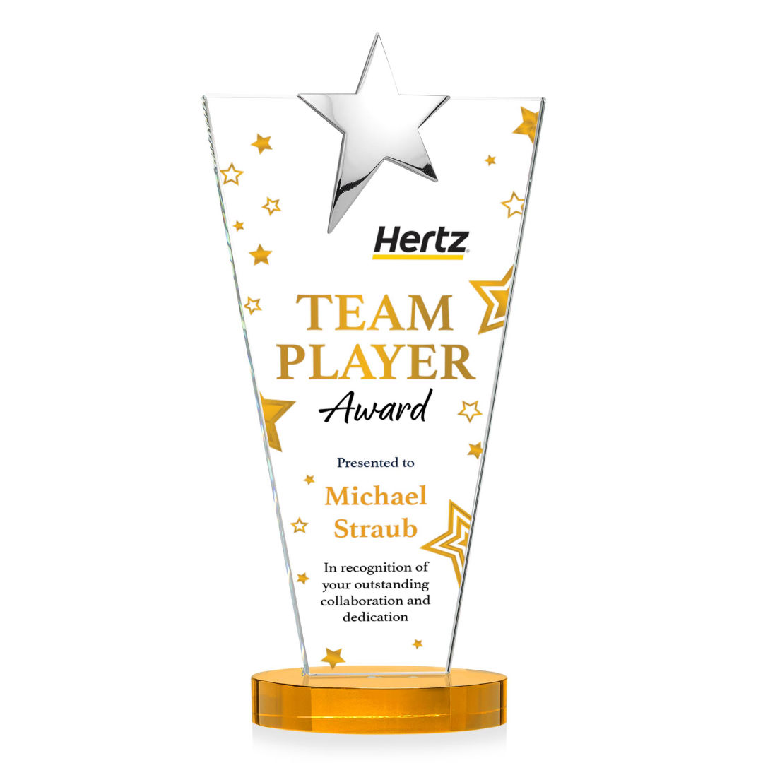 The Optical Crystal Mantella Star VividPrint™ Award features a sleek tapered rectangle design accented by a brilliant chrome or gold star at the top. Mounted on a clear oval optical crystal base, this award radiates prestige and celebrates stellar achievement. Bring your artwork to new heights with full-color VividPrint™! 3.625″ W x 7.5″ H x 2.75″ D