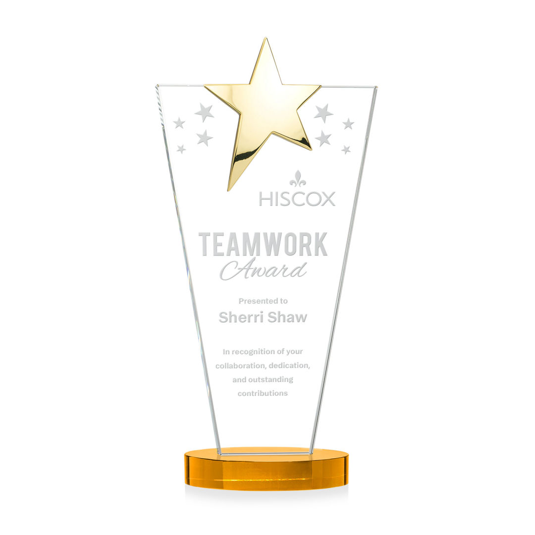 The Optical Crystal Mantella Star Award features a sleek tapered rectangle design accented by a brilliant chrome or gold star at the top. Mounted on a clear oval optical crystal base, this award radiates prestige and celebrates stellar achievement. 3.625″ W x 7.5″ H x 2.75″ D