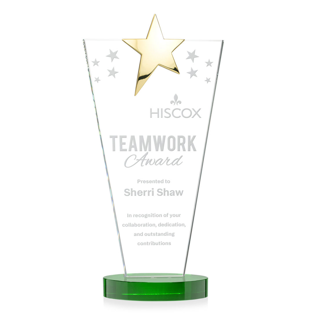 The Optical Crystal Mantella Star Award features a sleek tapered rectangle design accented by a brilliant chrome or gold star at the top. Mounted on a clear oval optical crystal base, this award radiates prestige and celebrates stellar achievement. 3.625″ W x 7.5″ H x 2.75″ D